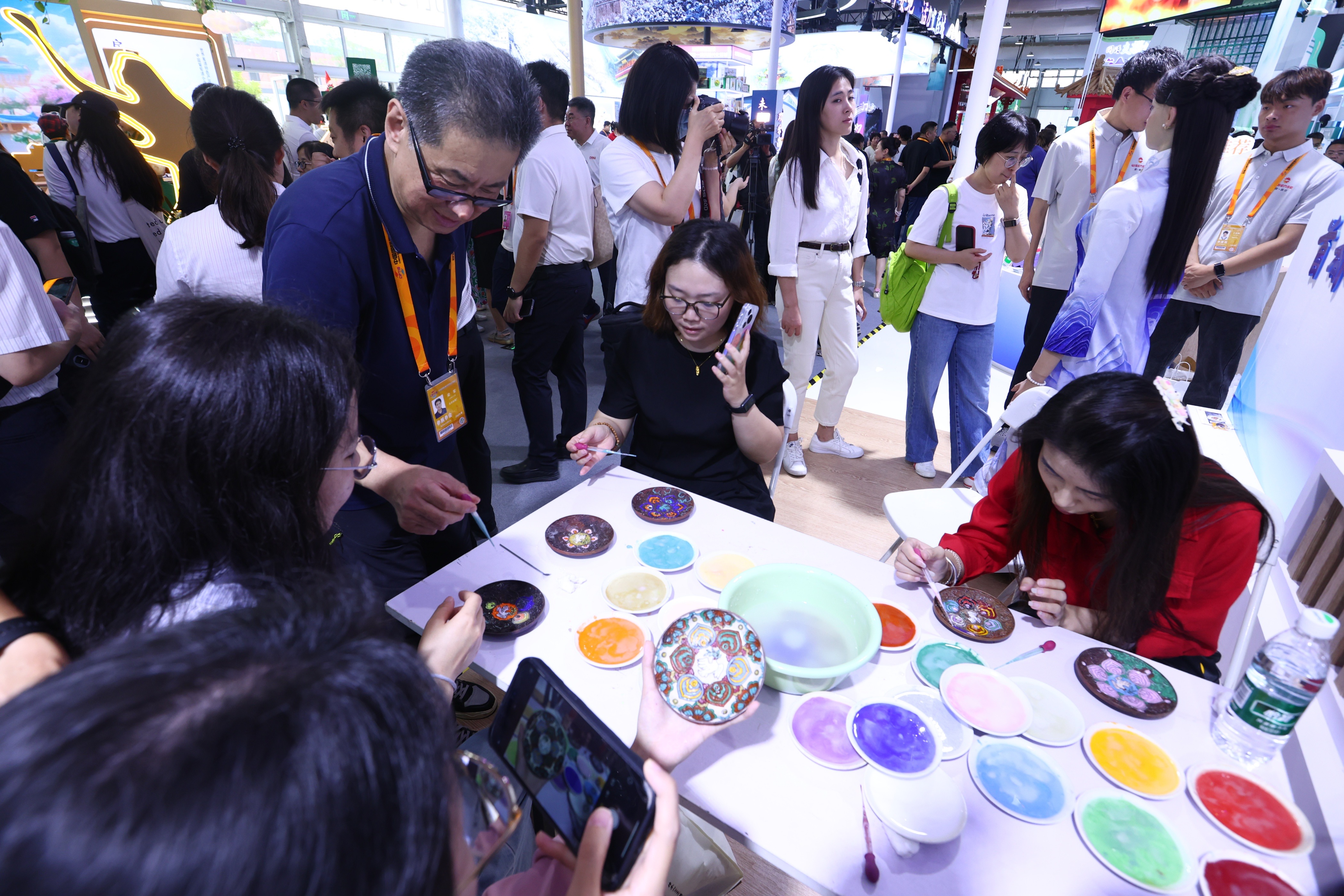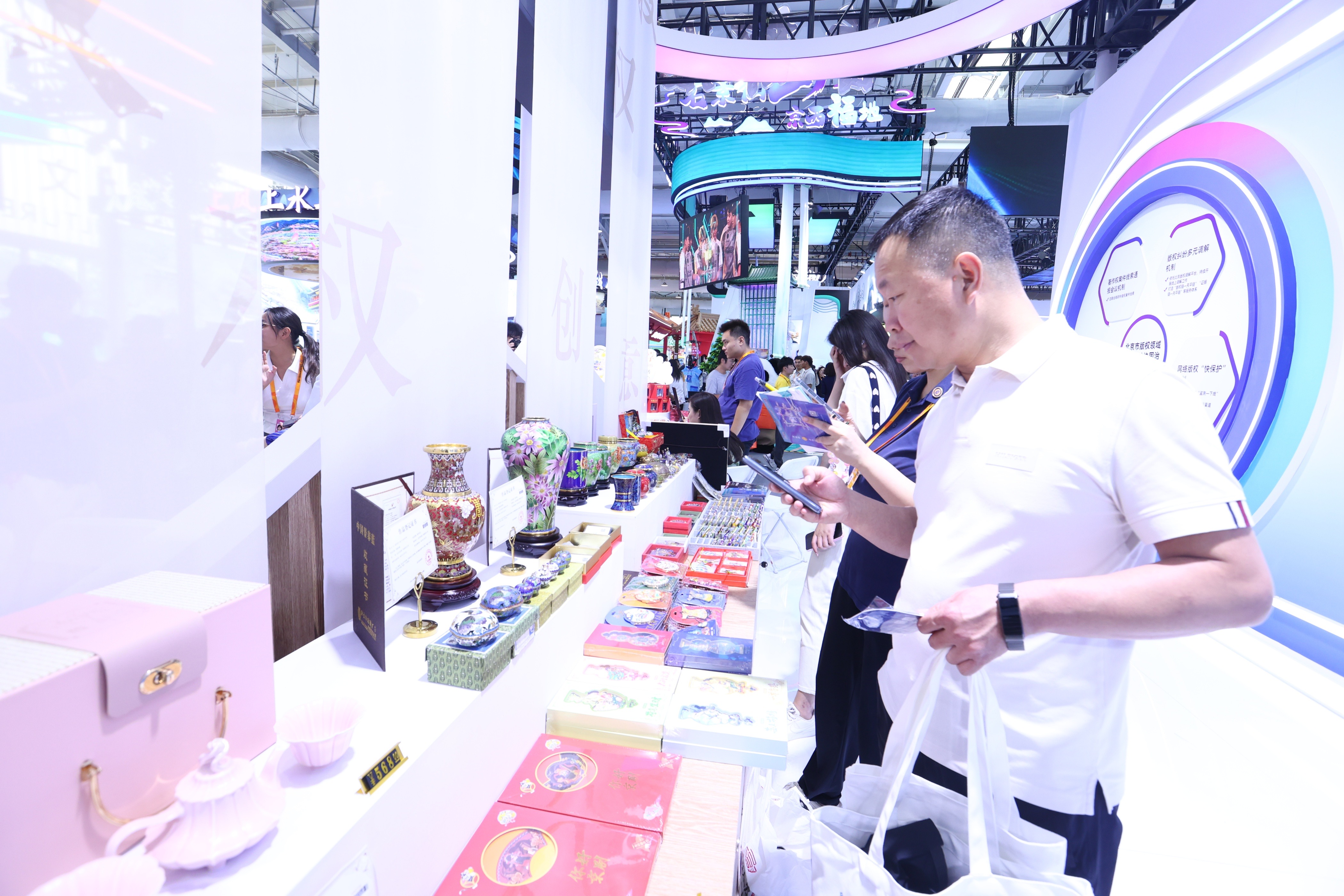 喜欢安静的观众可以尽情“看”。比如,有北京文化企业近年来的精品力作以及版权转化产品。在非遗展示与售卖区,瓷器、漆器、珐琅器吸引众多观众驻足观看、品味。中国字体设计的领军者汉仪字库公司还展示了以汉字版权为核心的文化创新成果。