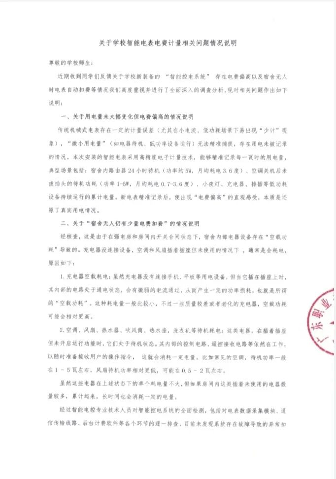 近期收到同学们反馈关于学校新装备的 “智能控电系统” 存在电费偏高以及宿舍无人时电表自动扣费等情况我们高度重视并进行了全面深入的调查分析,现对相关问题作出如下说明: