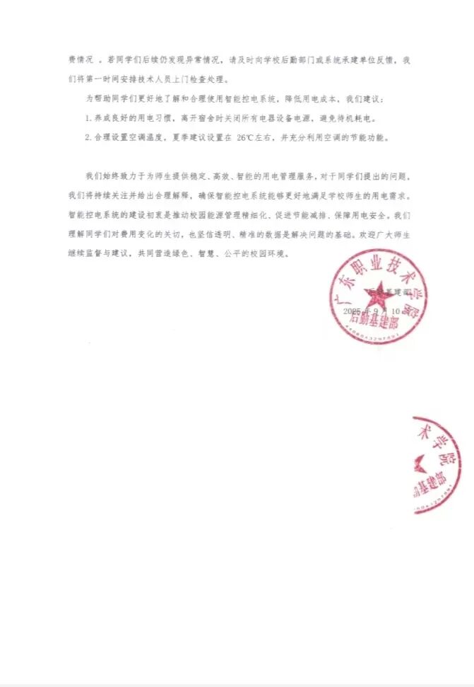 我们始终致力于为师生提供稳定、高效、智能的用电管理服务,对于同学们提出的问题,我们将持续关注并给出合理解释,确保智能控电系统能够更好地满足学校师生的用电需求。智能控电系统的建设初衷是推动校园能源管理精细化、促进节能减排、保障用电安全。我们理解同学们对费用变化的关切,也坚信透明、精准的数据是解决问题的基础。欢迎广大师生继续监督与建议,共同营造绿色、智慧、公平的校园环境。