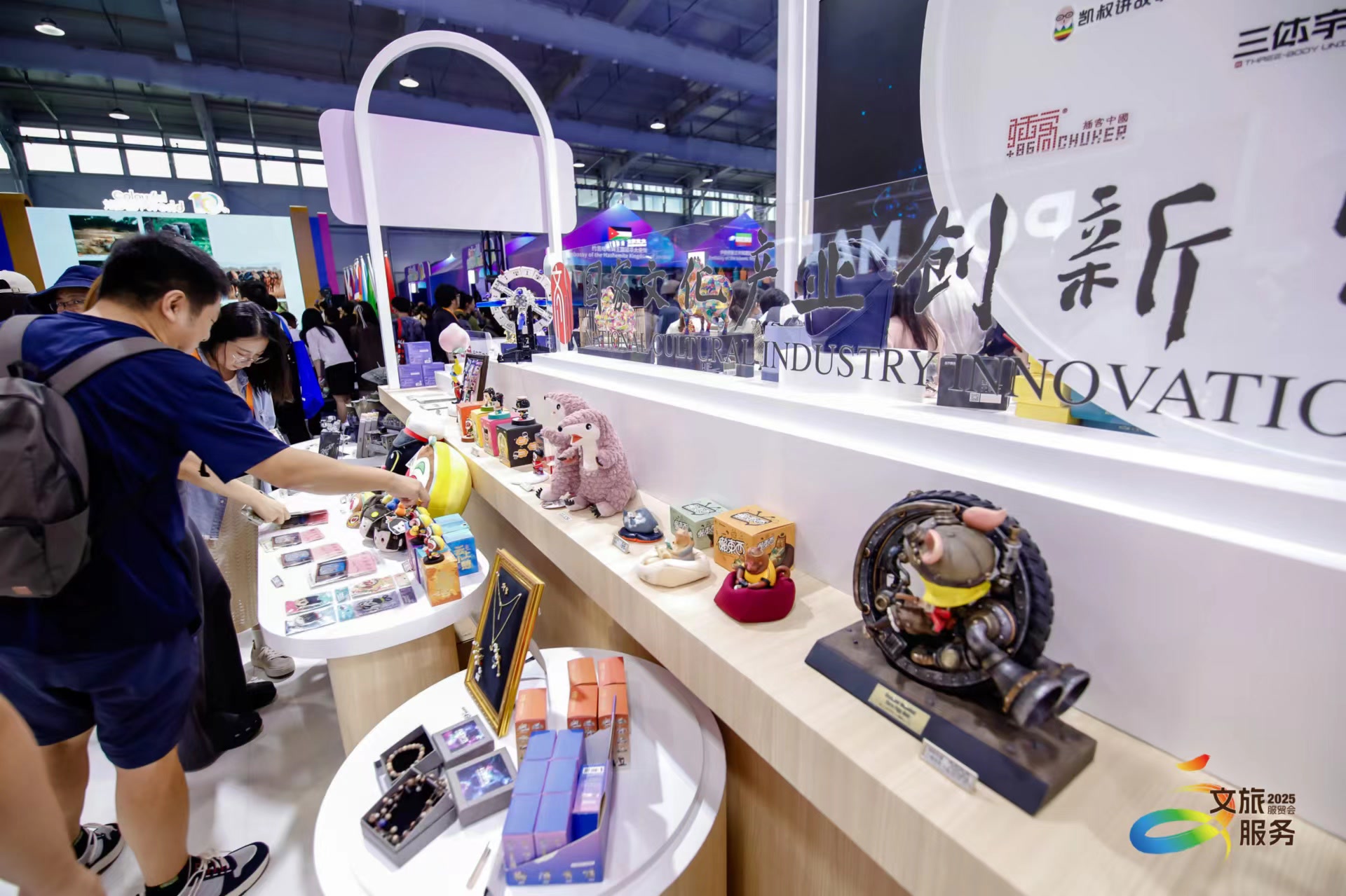 朝阳区的“国家文化产业创新实验区·国潮文创店”今年6月在潘家园旧货市场正式亮相。作为全市首家文创集合店,该店汇聚了潘家园自主研发的文创精品以及三体宇宙、凯声、果壳等十余家知名品牌的百余款特色文创产品。在服贸会现场,三体宇宙展出了《三体》IP全产业链开发的书籍、模型等优质文创产品,让科幻迷们大饱眼福;凯声则推出了“鸡飞飞”等多款原创AI故事玩偶和系列故事学习机、点读机等产品,为观众提供丰富选择。