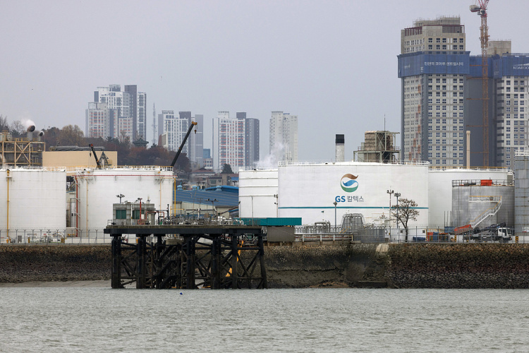 韩国石化企业GS加德士位于仁川港的石油储备罐。