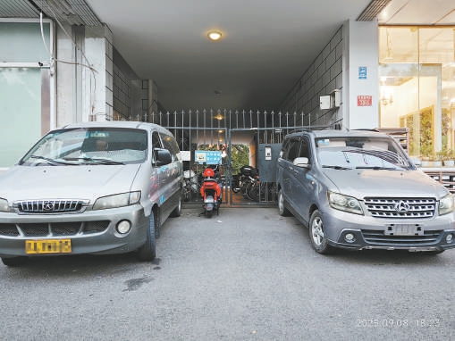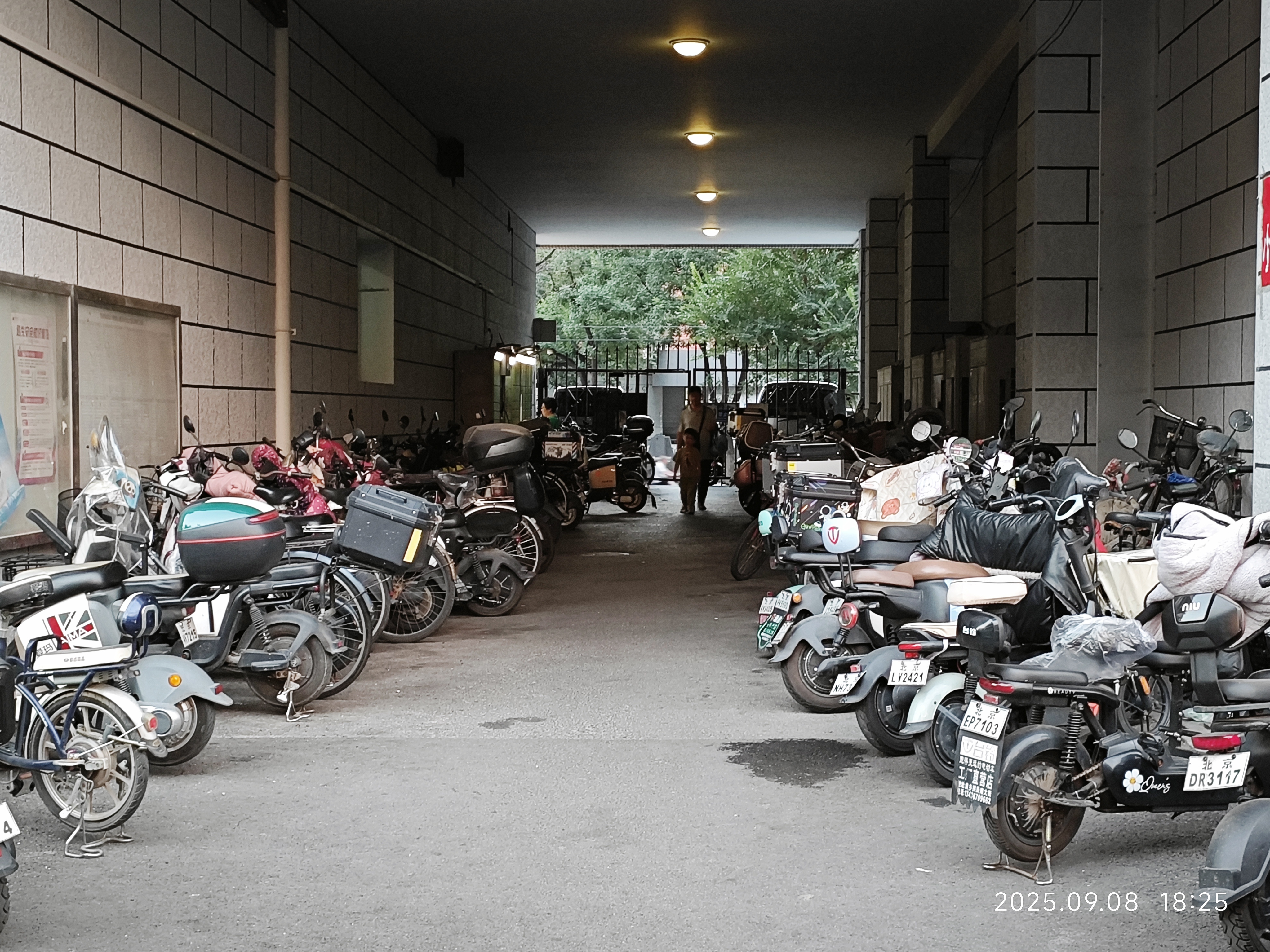 8月25日和9月8日,记者两次来到芳群园四区23号楼。该楼的一层为小区底商,底商之间的门洞成为该楼的消防通道,通道尽头的大门内外两侧都挂有“消防通道禁止停车”的牌子。两条消防通道分别位于23号楼的中间及南侧。在两次探访中记者发现,这两条消防通道的外侧都停满了机动车,通道内侧则如居民所说被成排的非机动车占据。其中,楼中间的消防通道里竟停着几十辆非机动车。