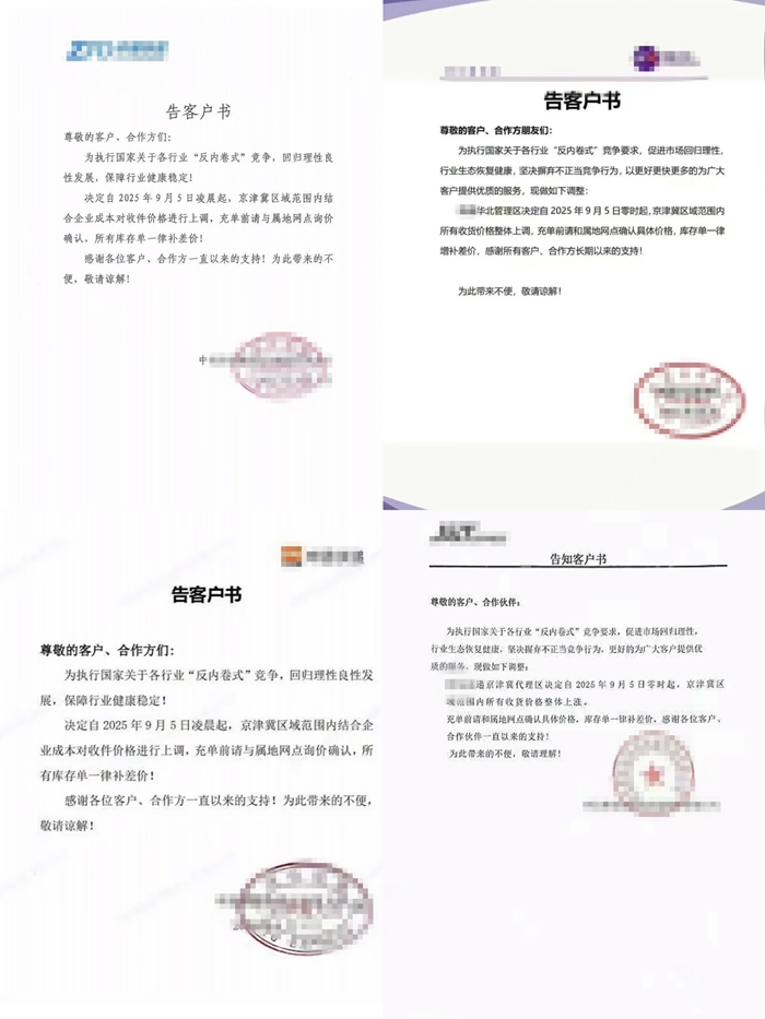 多家快递公司发涨价通知。社交平台截图。