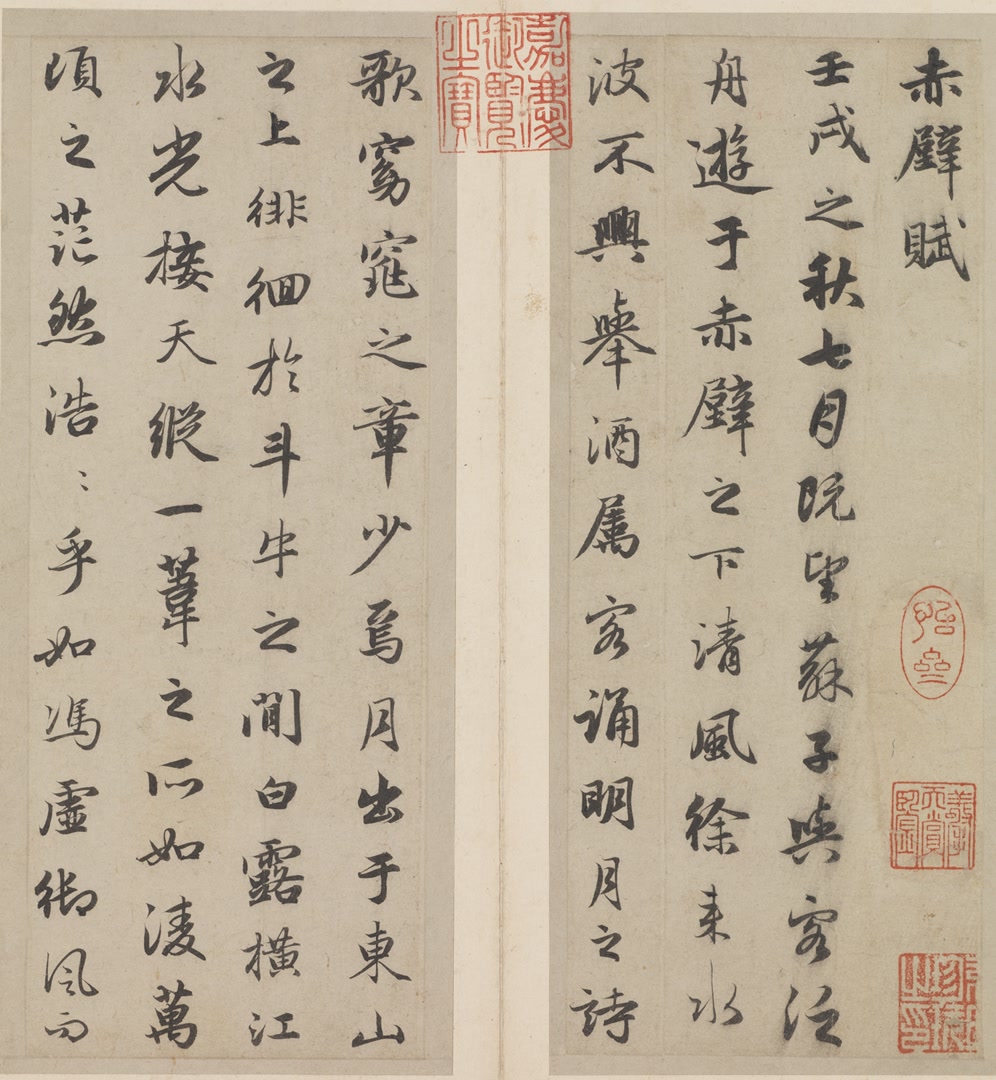 释文:赤壁赋 壬戌之秋,七月既望,苏子与客泛舟游于赤壁之下。清风徐来,水波不兴。举酒属客,诵明月之诗,歌窈窕之章。少焉,月出于东山之上,徘徊于斗牛之间。白露横江,水光接天。纵一苇之所如,凌万顷之茫然。浩浩乎如冯虚御风,而……