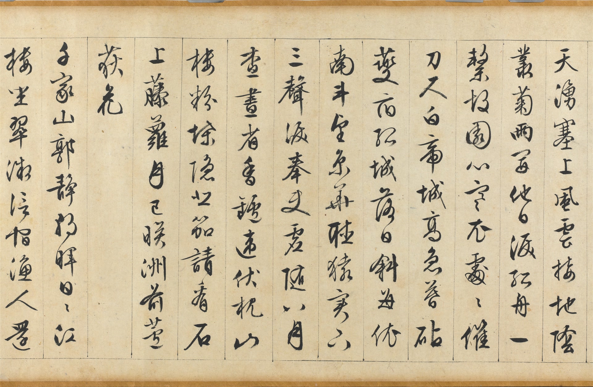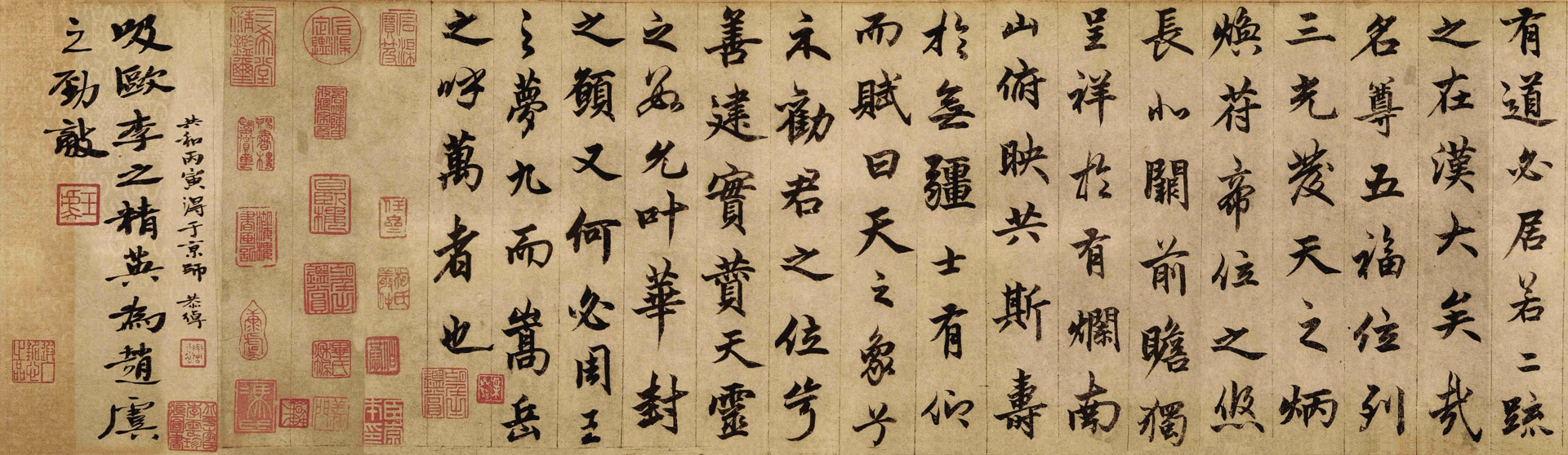文人志士想要效力于朝廷却求而不得的例子举不胜举,望向星空怅然若失。而已服侍在君王左右的宠臣唯愿皇权永固,夜观天象为其占卜前程。在柯九思的《老人星赋》中写道:“有道必居,若二疏之在汉,大矣哉。名尊五福,位列三光,发天之炳焕,苻帝位之悠长。北阙前瞻,独呈祥于有烂。南山俯映,共斯寿于无疆。”老人星是南方天空的一颗二等星,俗称寿星。全篇以描述星象出发,歌颂君主万寿无疆。长卷以楷书书写,至文末渐有行书笔意,笔法可见欧阳询的挺劲,又融进了魏晋的意味。长卷用墨饱满、中正平和,有铁骨铮铮、刀光剑影的质感。