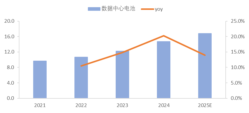 数据中心规模的快速扩张和单机柜功率密度的大幅提升对备电容量有更大需求,显著推动UPS需求增长,也同步带动UPS重要组件——电池出货量提升。同时,数据中心电池也开始参与“数据中心+储能”应用方向,通过保障电力稳定、消纳可再生能源、参与电网调节,支撑了“算力-电力”的动态平衡。