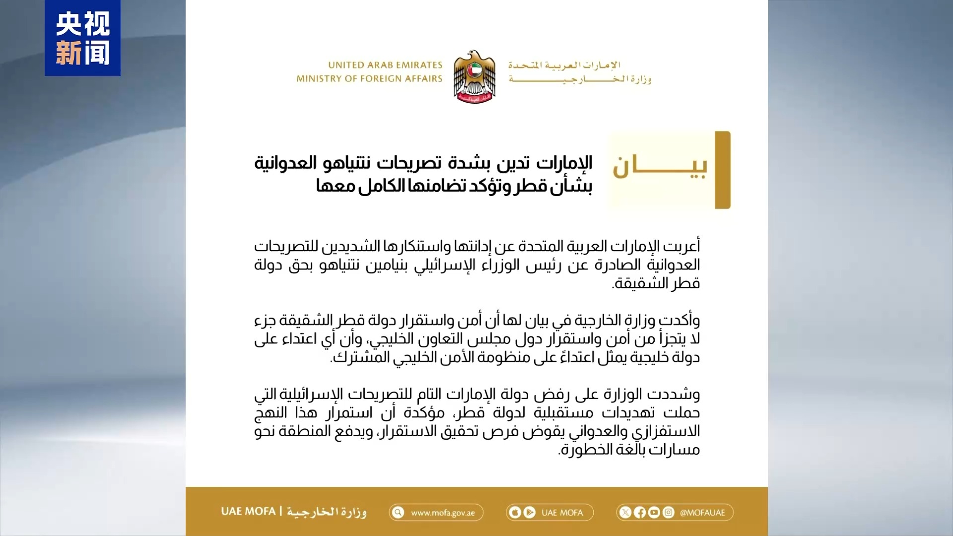 阿联酋外交部11日发表声明,强烈谴责以色列总理内塔尼亚胡针对卡塔尔发表的敌对言论。声明强调这种敌对言论会将该地区推向极其危险的境地。