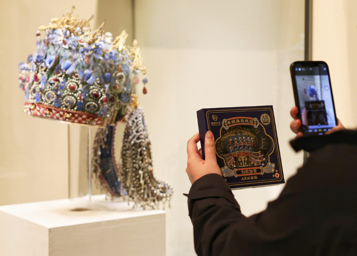 中国国家博物馆,购买到凤冠冰箱贴的游客来到展厅和“本尊”合影 图源:“新华网”微信公众号