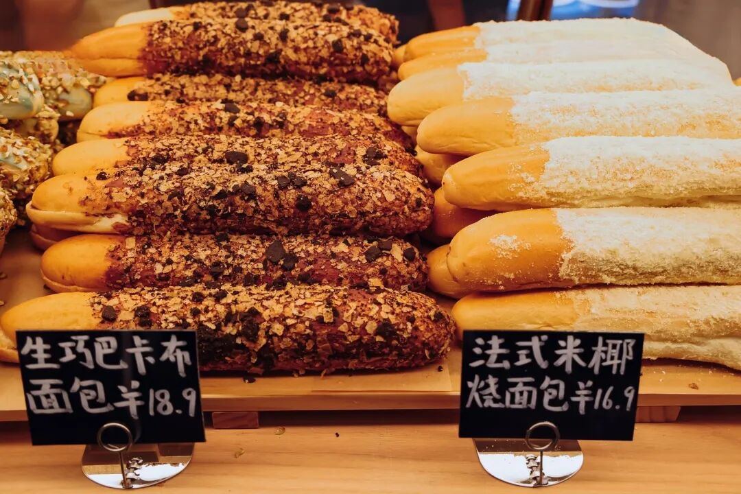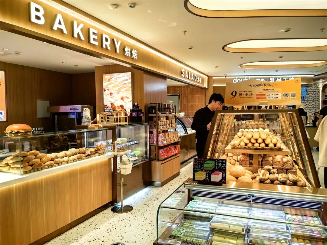 烘焙区异形灯箱结合地面水磨石瓷砖