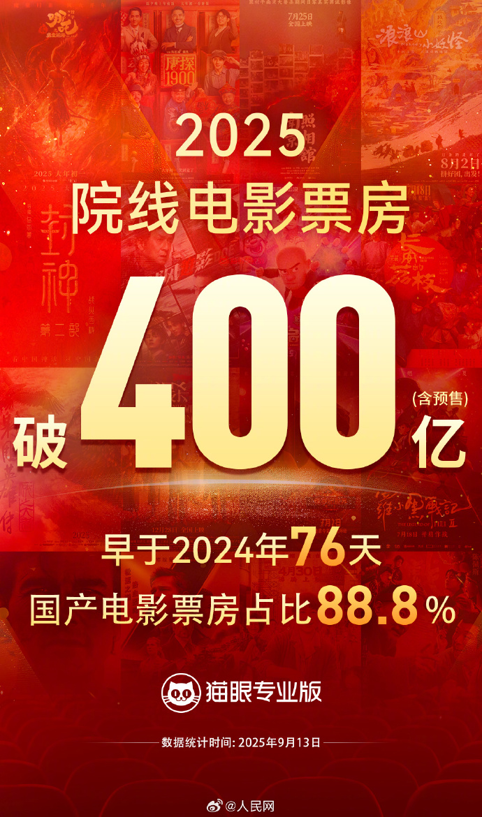 据猫眼专业版数据,2025年9月13日13时05分,2025年度票房(含预售)破400亿,早于2024年76天到达,国产电影票房占比超88.8%,2025年度票房榜前十均为国产片。