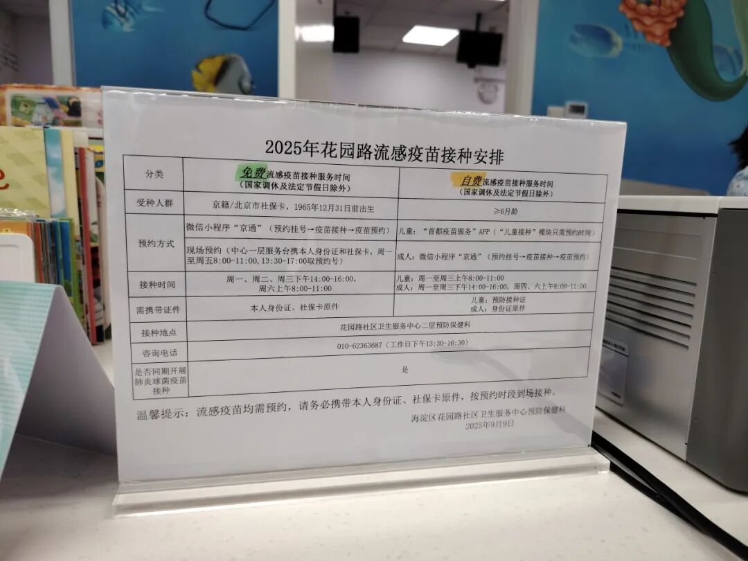 “今年的流感疫苗接种,是从9月10日正式启动的。免费的流感疫苗预计接种到今年11月底,自费的流感疫苗持续接种到明年2月。市民可以现场预约或者通过微信京通小程序线上预约来接种。”花园路社区卫生服务中心预防保健科科长周鑫介绍。