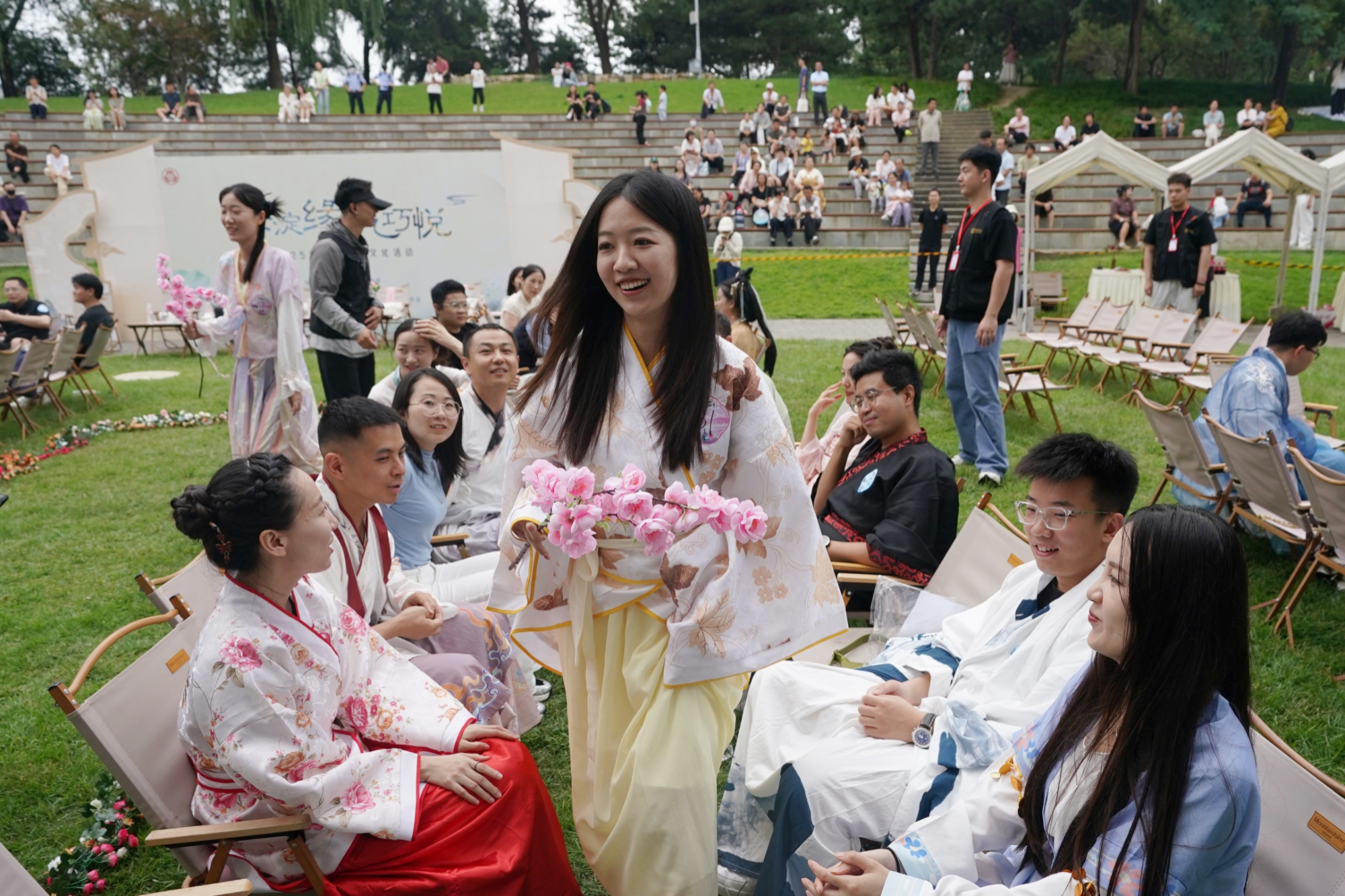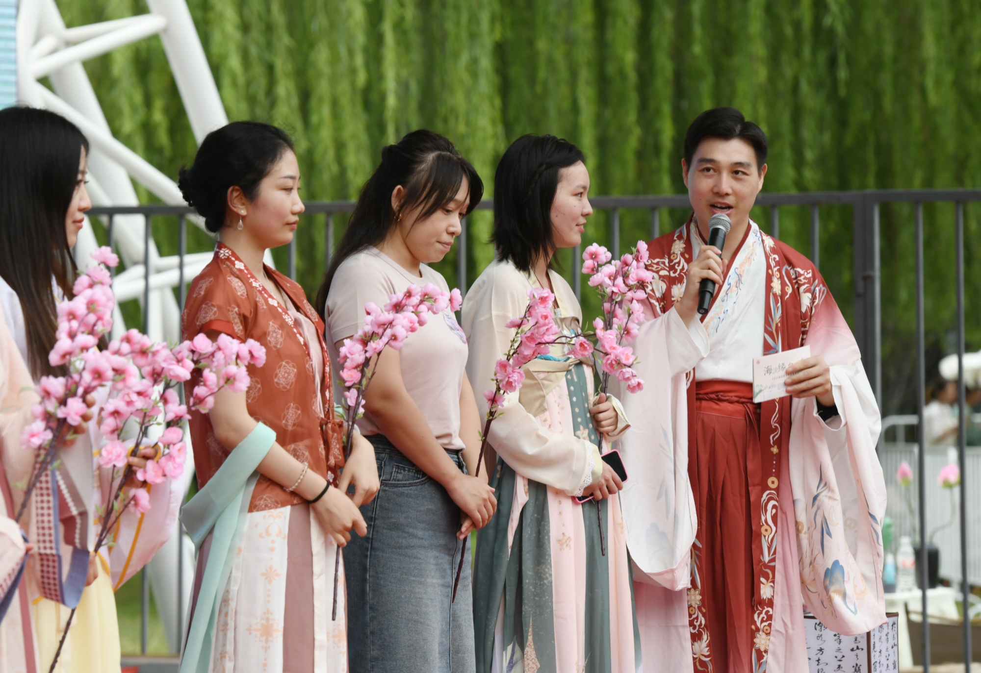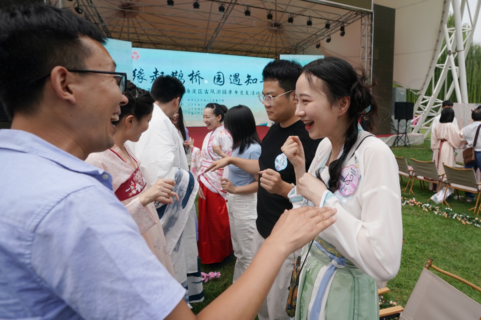 身着古装拍照打卡、体验非遗工坊、男女组队参与游戏,9月13日,海淀区妇联主办的“缘起鹊桥·园遇知音”传统文化主题联谊活动在海淀公园拉开帷幕,为机关企事业单位的120名单身青年搭建交友平台,让参与者在感受传统文化魅力的同时,增进文化认同,促进情感交流。