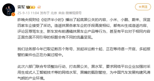 9月13日,雷军在社交媒体针对“黑公关”一事发文。