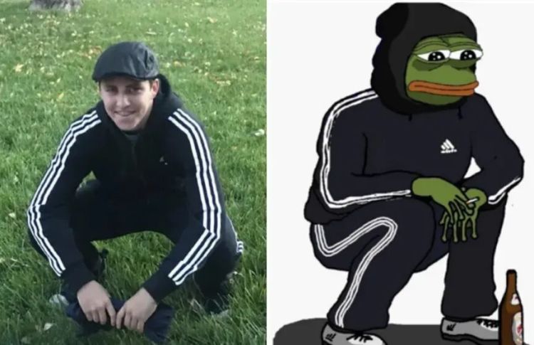 报道援引一张网民翻出的罗宾逊旧照指出,罗宾逊曾穿着一件运动服蹲在地上,这个动作非常像“悲伤蛙”表情包,而该表情包则是“格罗伊珀”团体的标志性符号。