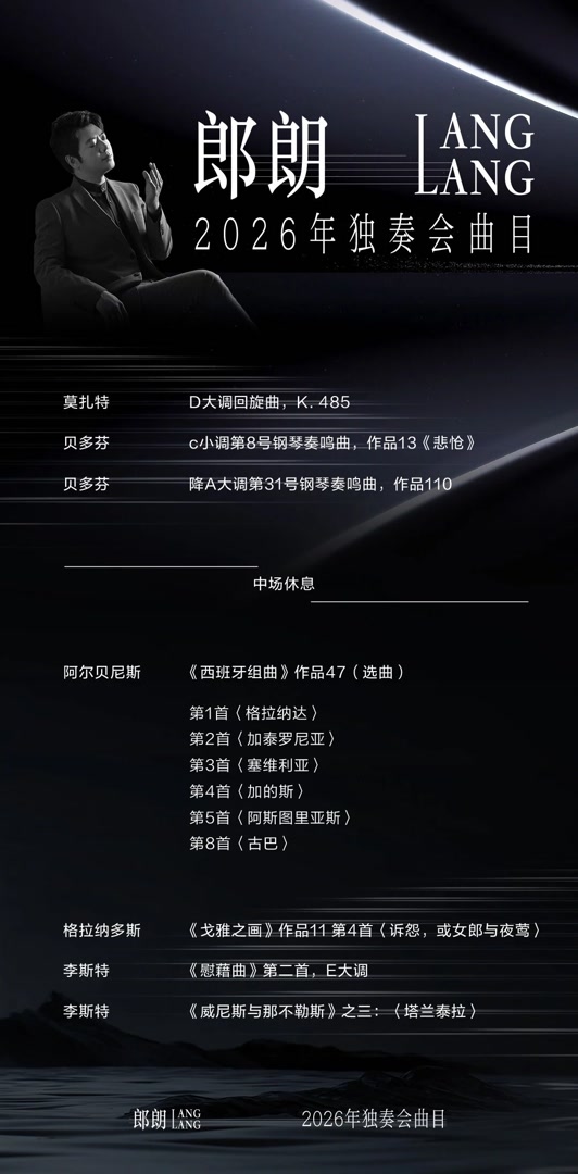 在2025-2026全球巡演音乐季中,郎朗将完整上演全套贝多芬钢琴协奏曲、拉赫玛尼诺夫《第二钢琴协奏曲》、柴科夫斯基《第一钢琴协奏曲》、格什温《蓝色狂想曲》等共计12首钢琴协奏曲,9月23日,在纽约林肯中心,郎朗将奏响对中国人民而言意义非凡的《黄河》钢琴协奏曲。独奏、重奏音乐会方面,新乐季的相关场次多达30余场,共策划5套曲目。目前,包括福雷《帕凡舞曲》、舒曼《克莱斯勒偶记》、肖邦《玛祖卡》等作品在内的独奏曲目正在巡演中,2026年1月1日,郎朗将更新独奏曲目单,涵盖莫扎特、贝多芬、李斯特、阿尔贝尼斯的经典旋律,纪念自己儿时的学琴生涯,其中,以g小调快板和独特内涵而闻名的李斯特《塔兰泰拉》是他小时候最喜欢的一首作品。此外,郎朗还将呈现钢琴小提琴二重奏、钢琴三重奏等三套音乐会作品。