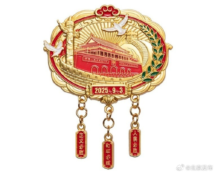 在天安门地区管委会指导下,天旅集团开发推出了这两款文创产品。抗战胜利80周年纪念徽章采用东方审美的装饰性轮廓,边缘曲线为祥瑞纹样,既典雅气韵,又不失庄重感。整体布局以天安门为视觉中心,长城、华表等元素环绕聚拢,让视觉焦点自然落于“抗战胜利与国家象征”的核心表意上。小小的徽章上,还有和平鸽、麦穗、橄榄枝等生动细节。九三阅兵现场,直升机上悬挂的“正义必胜”“和平必胜”“人民必胜”条幅让人印象深刻。在抗战胜利80周年纪念大会徽章上,也能见到这一元素。三个“必胜”做成了标语吊牌垂直排列,让核心精神标语更有仪式感,也丰富了整个产品的灵动性。