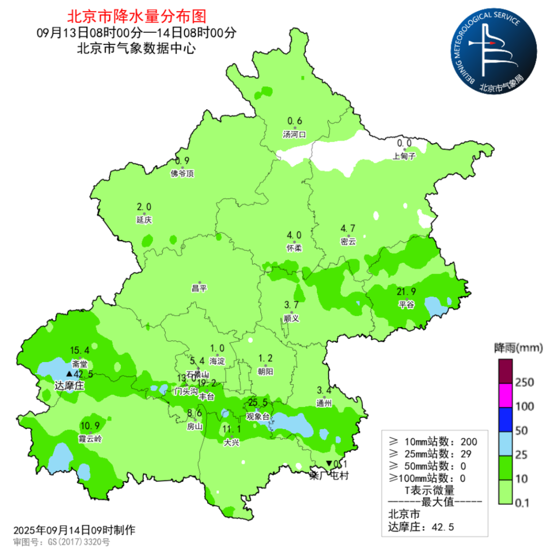 13日08时至14日08时降水量(毫米):全市平均6.9,城区平均(朝,海,丰,石,东,西)5.8,西南(门,房)10.6,东南(通,大)9.2,东北(密,顺,平,怀)5.7,西北(延,昌)3.4;城区最大丰台千灵山31.7,全市最大门头沟达摩庄42.5,最大小时雨强通州东马各庄村34.3毫米/小时(13日19时-20时)。
