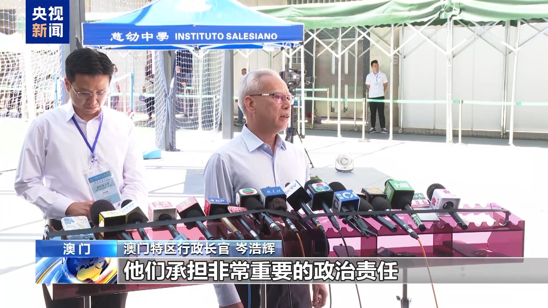 澳门特区行政长官 岑浩辉:作为管治团队重要组成部分的立法会议员,必须体现“爱国者治澳”,爱国爱澳原则,所以新的一届立法会议员,他们承担非常重要的政治责任、法律责任、民意代表的责任。我希望各位选民在行使好法律赋予的选举权利的同时,积极参与到整个立法会的选举中,共同使行政机关和立法机关一起为澳门特别行政区下一阶段的政治经济发展,践行“一国两制”作出共同的努力。