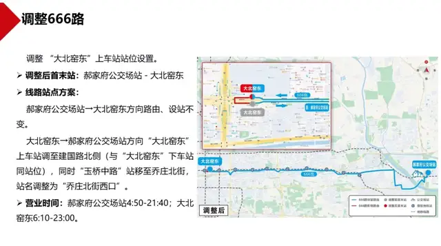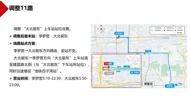 大北窑东→郝家府公交场站方向“大北窑东”上车站调至建国路北侧(与“大北窑东”下车站同站位),同时“玉桥中路”站移至乔庄北街,站名调整为“乔庄北街西口”。
