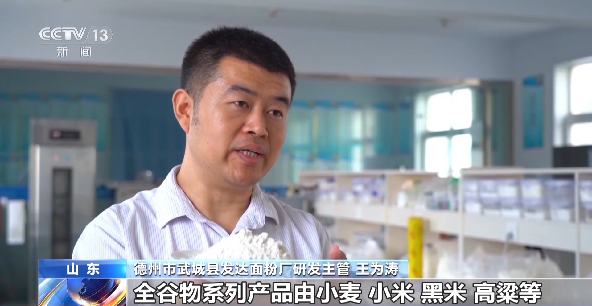 德州市武城县发达面粉厂研发主管 王为涛:全谷物系列产品由小麦、小米、黑米、高粱等十种谷物科学配比而成,营养更全面,口感也更丰富。