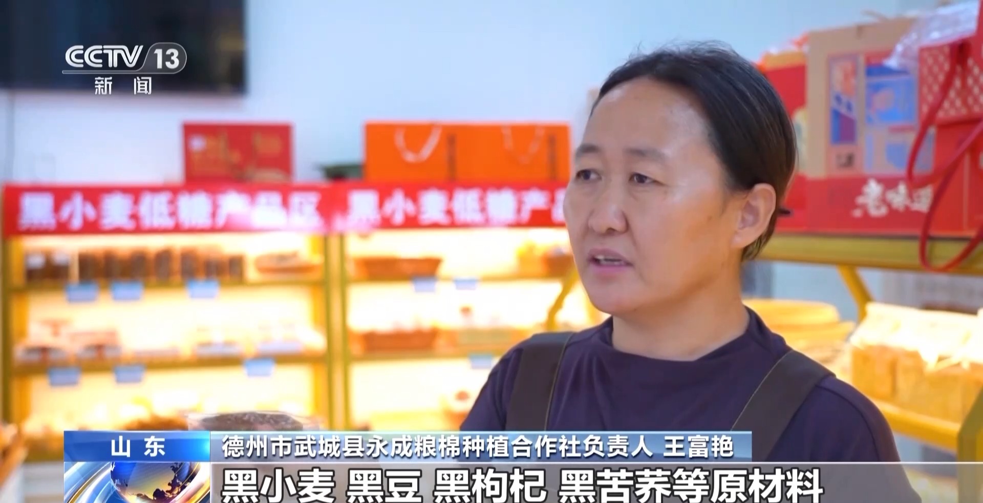 德州市武城县永成粮棉种植合作社负责人 王富艳:黑小麦、黑豆、黑枸杞、黑苦荞等原材料,采用低温烘焙工艺,最大限度保留营养成分。