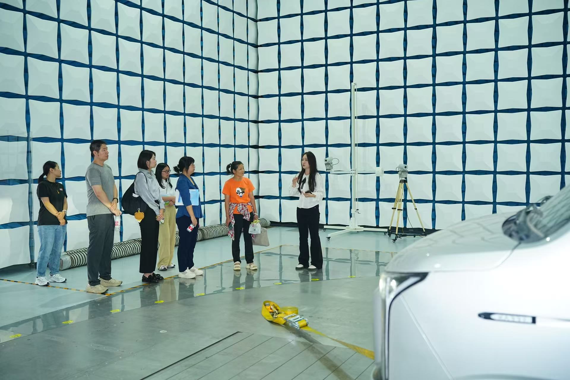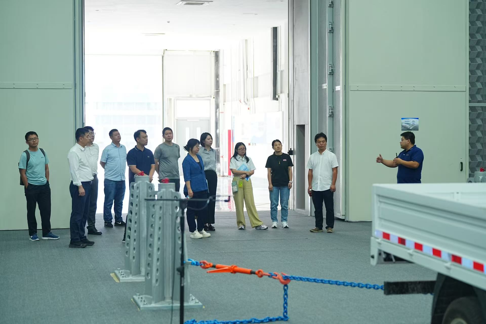 参观人员进入国家氢燃料电池汽车质量检验检测中心(筹)实验室,实地了解国内领先的氢燃料电池汽车检测平台与技术。整车NVH试验室可以模拟不同行驶工况,测量车内外噪声、低速提示音、近场噪声、通过噪声等项目。接着,参观人员来到全景环视系统试验室,该试验室是目前京津冀地区最大的全景环视系统试验室,具备整车级别的测试能力,适用于乘用车、客车、牵引车等测试。在车载影像系统试验室,可以测试车载影像设备,比如汽车上的摄像头、电子后视镜、行车记录仪等,通过高精度的设备和专业的软件,来评估这些设备的图像质量、系统延迟等关键性能指标。