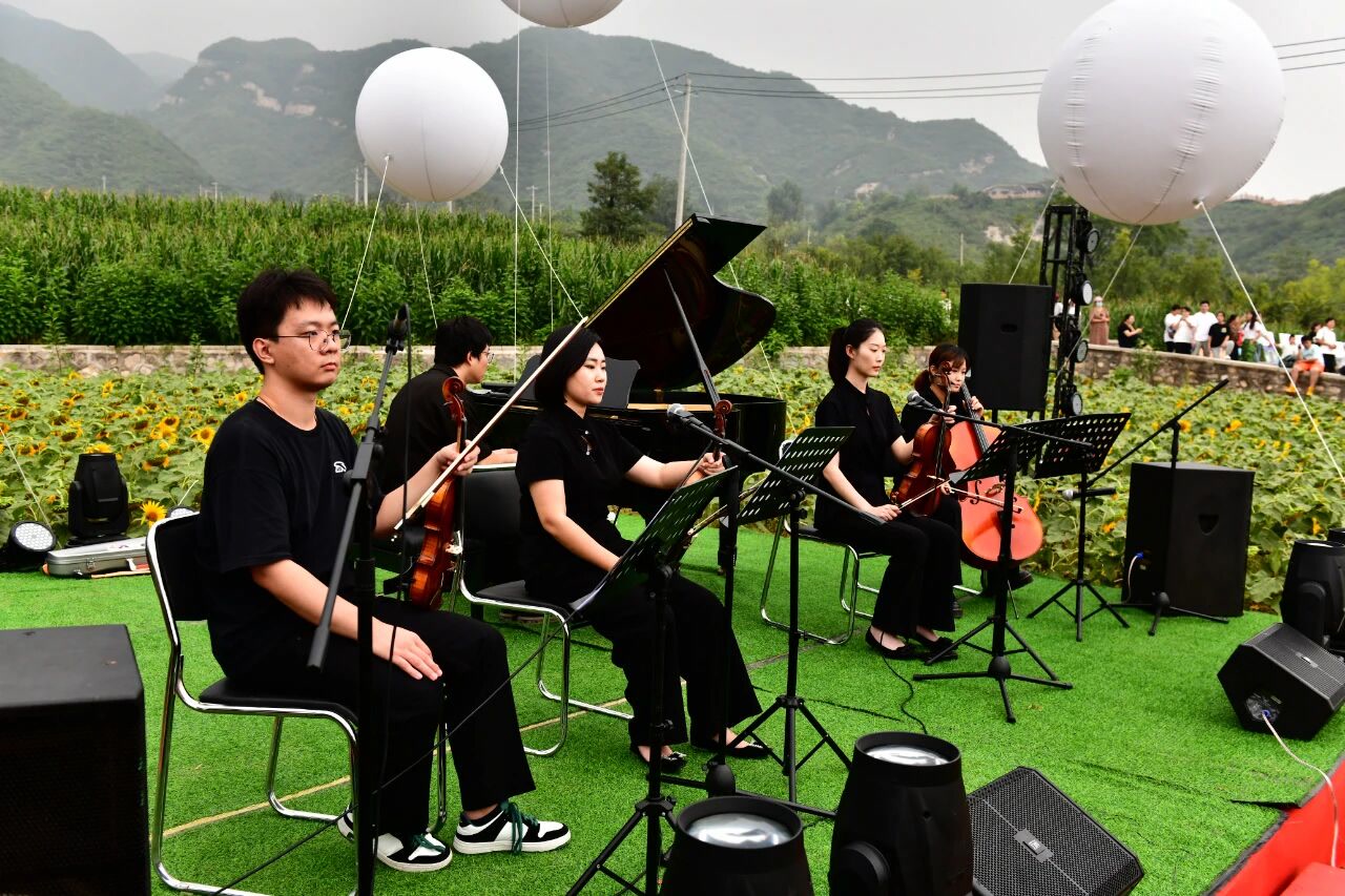 9月13日,Dimo古典重奏乐团以一曲悠扬的《卡农》拉开序幕。在金黄灿烂的向日葵花海背景下,张博然、刘晓唯等演奏家以精湛技艺演绎经典声乐作品。