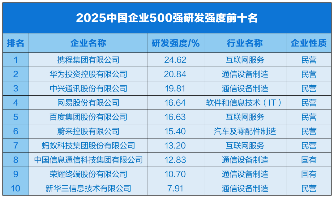 2025中国企业500强共投入研发费用1.73万亿元,平均研发强度创下1.95%的新高,连续第8年提升;近六成企业的研发强度同比都有所提升。