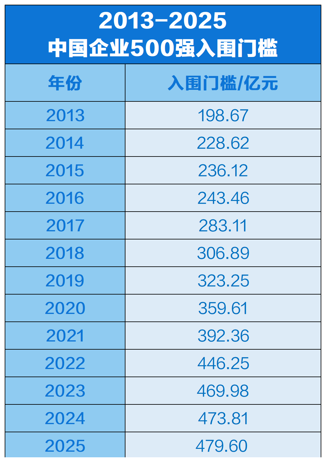 2025中国企业500强入围门槛达到479.60亿元,提升5.79亿元,实现23连升。