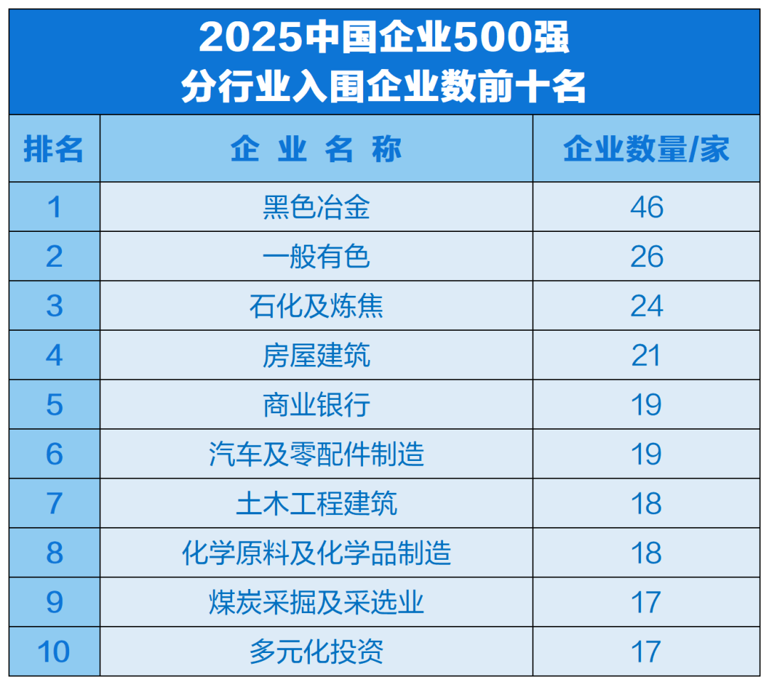 2025中国企业500强中,制造业263家,服务业169家,其他行业68家;有39家新入围或重新入围企业,分布于汽车及零配件制造、互联网服务等行业。