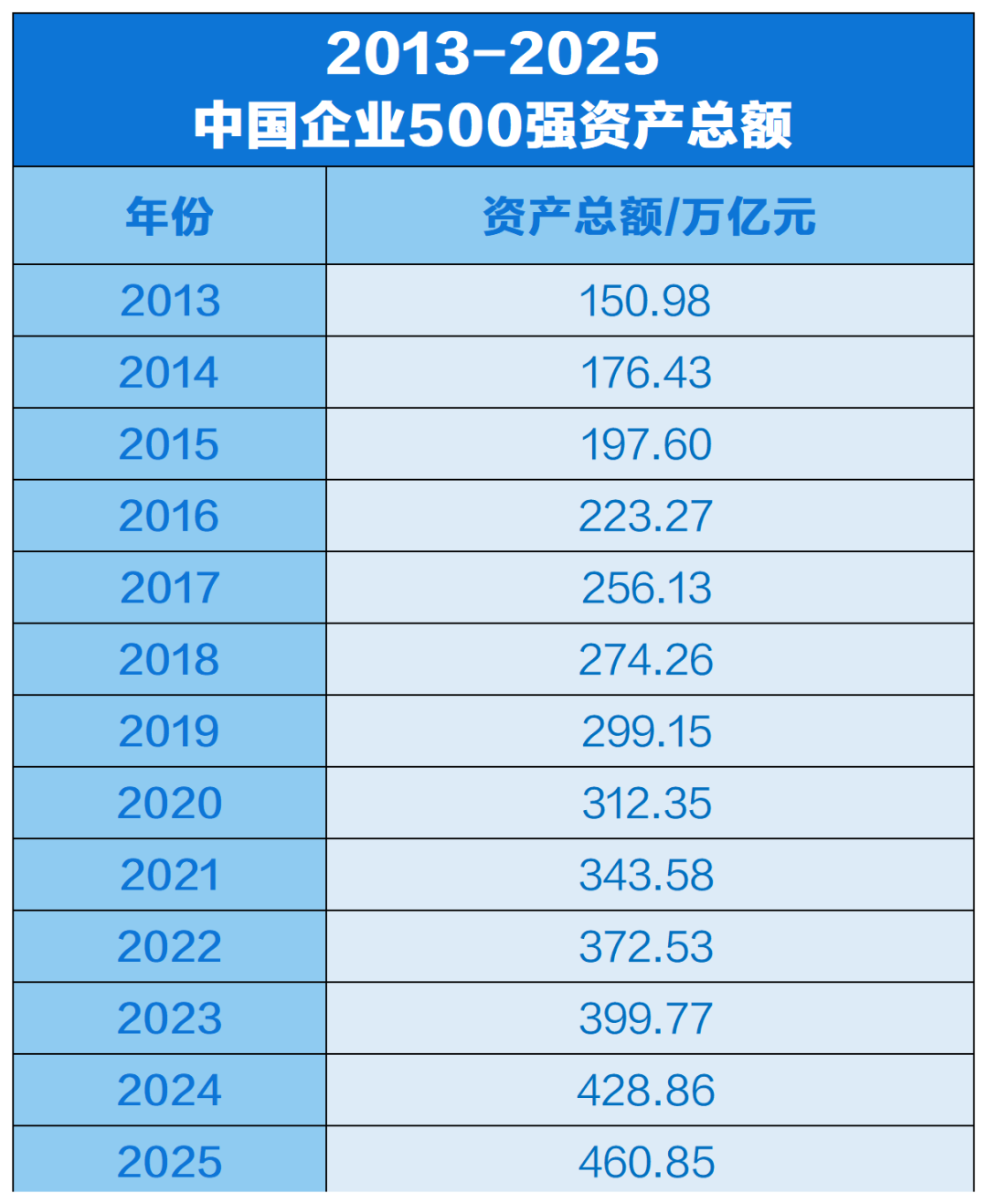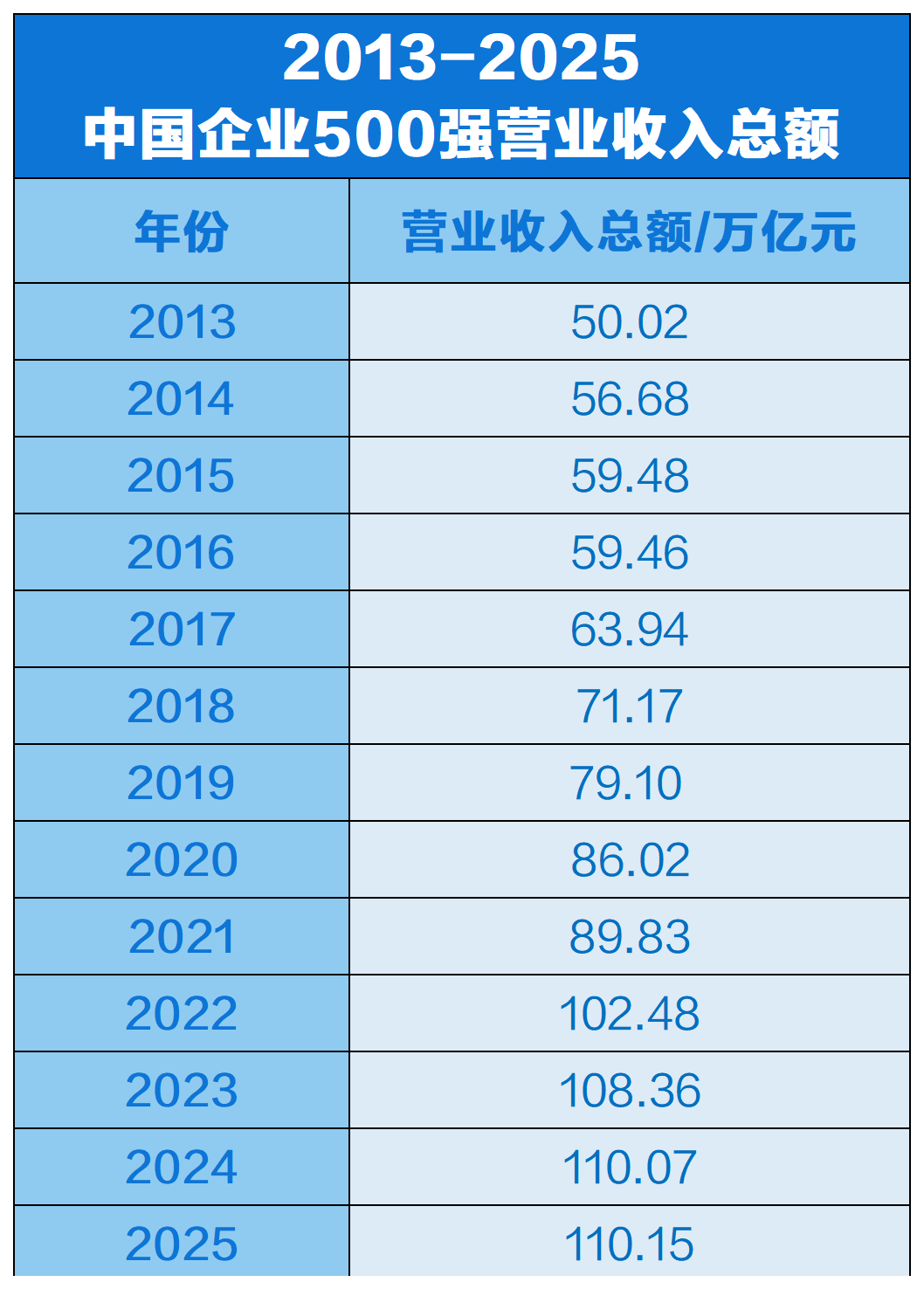 2025中国企业500强营业收入达110.15万亿元,较上年500强有所增加。资产总额为460.85万亿元,增长7.46%。
