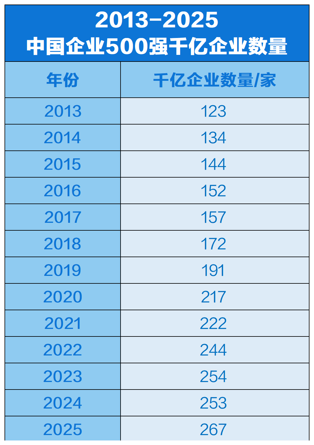 2025中国企业500强中,营业收入超过1000亿元的企业数量为267家,较上年增加14家,千亿级企业占比达53.4%。