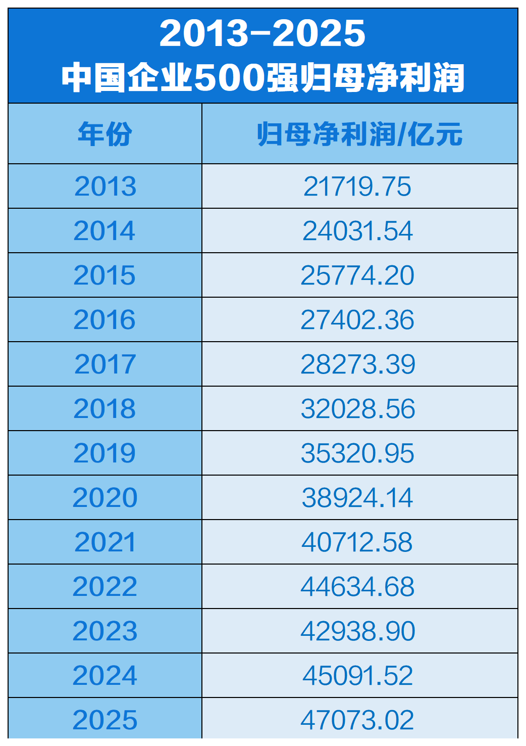 2025中国企业500强实现归属母公司所有者净利润总额为4.71万亿元,较上年增长4.39%,收入净利润率为4.27%,比上年提高0.17个百分点。