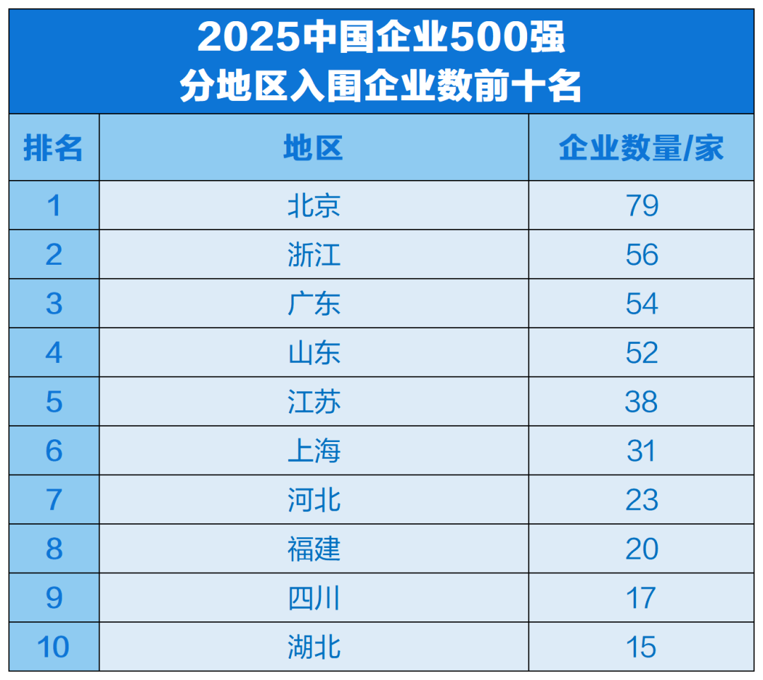 2025中国企业500强共分布在30个省(自治区、直辖市)中,分布最多的五个地区依次是北京、浙江、广东、山东和江苏。