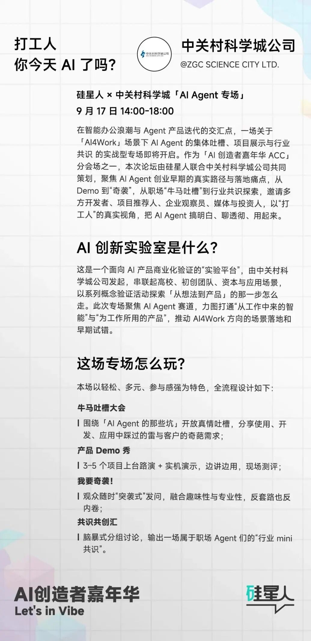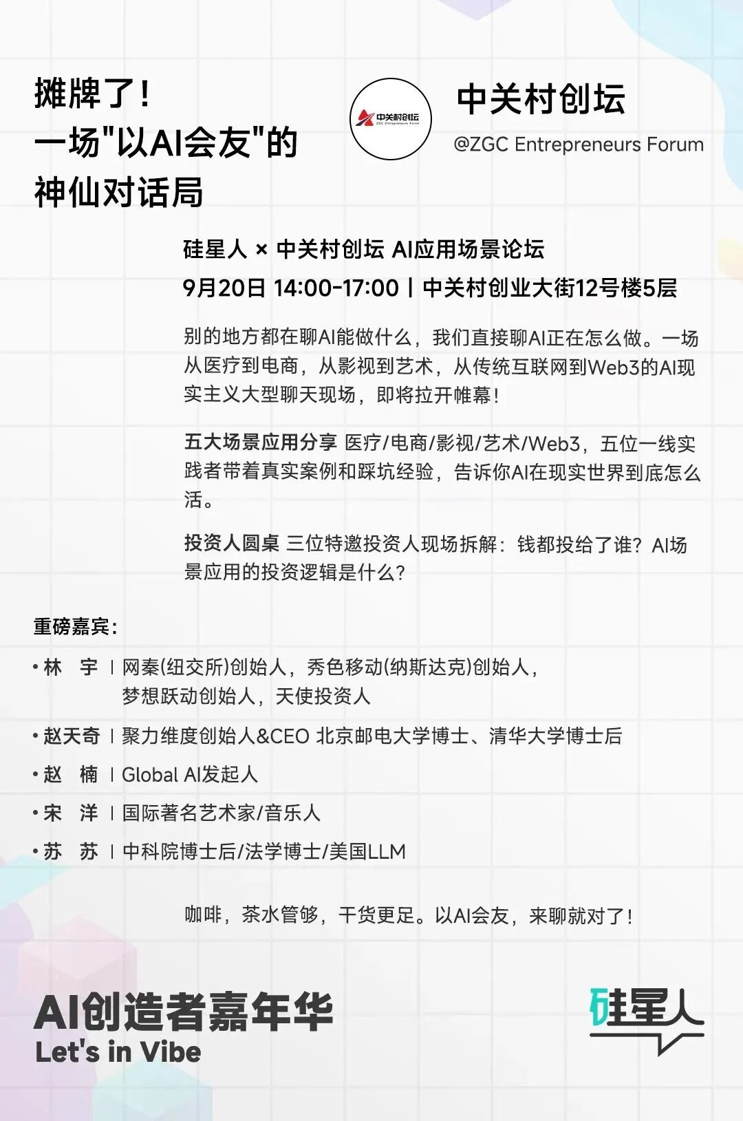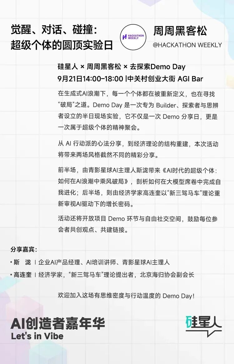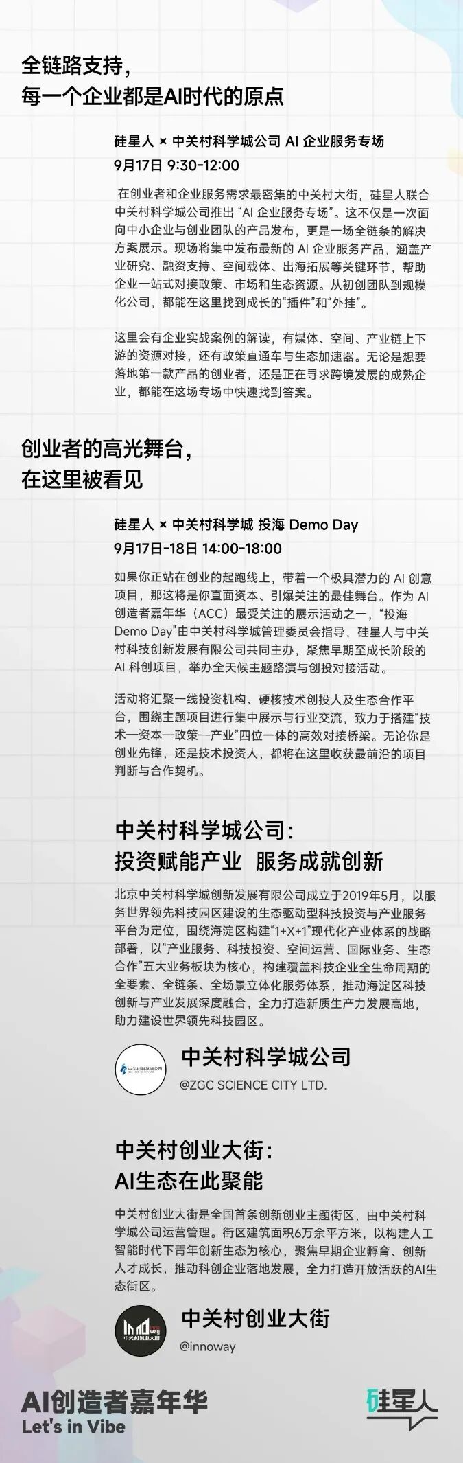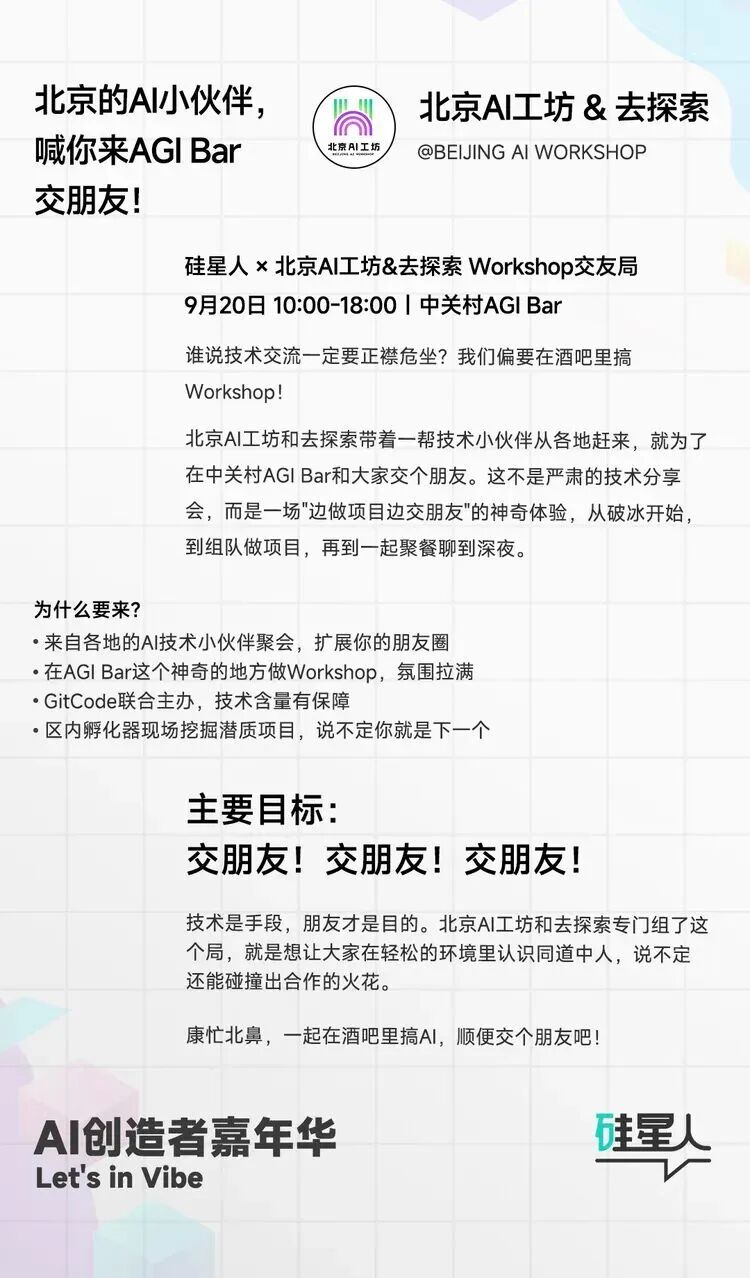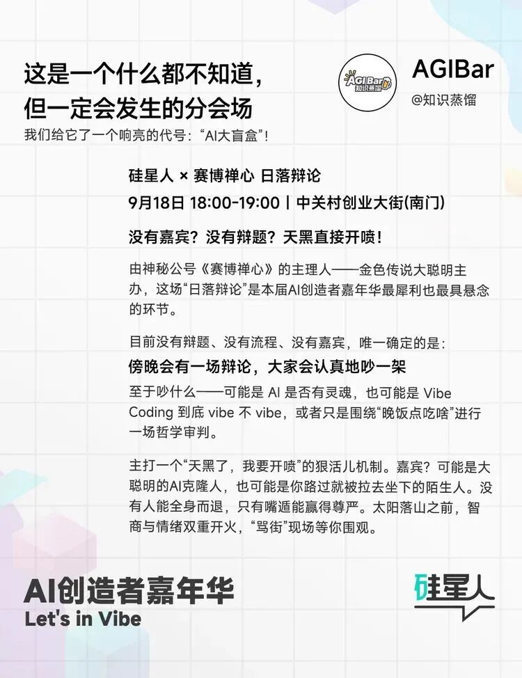 从NoCode工具的极速落地,到通往科学边界的AI探索;从新范式企业的真实表达,到中关村创新土壤里的生态跃动;从打工人视角切入的行业解构,到AI玩家的社交挑战与资金链接……这一天,大街上每个角落都在同步上演属于AI创造者的独立舞台。
