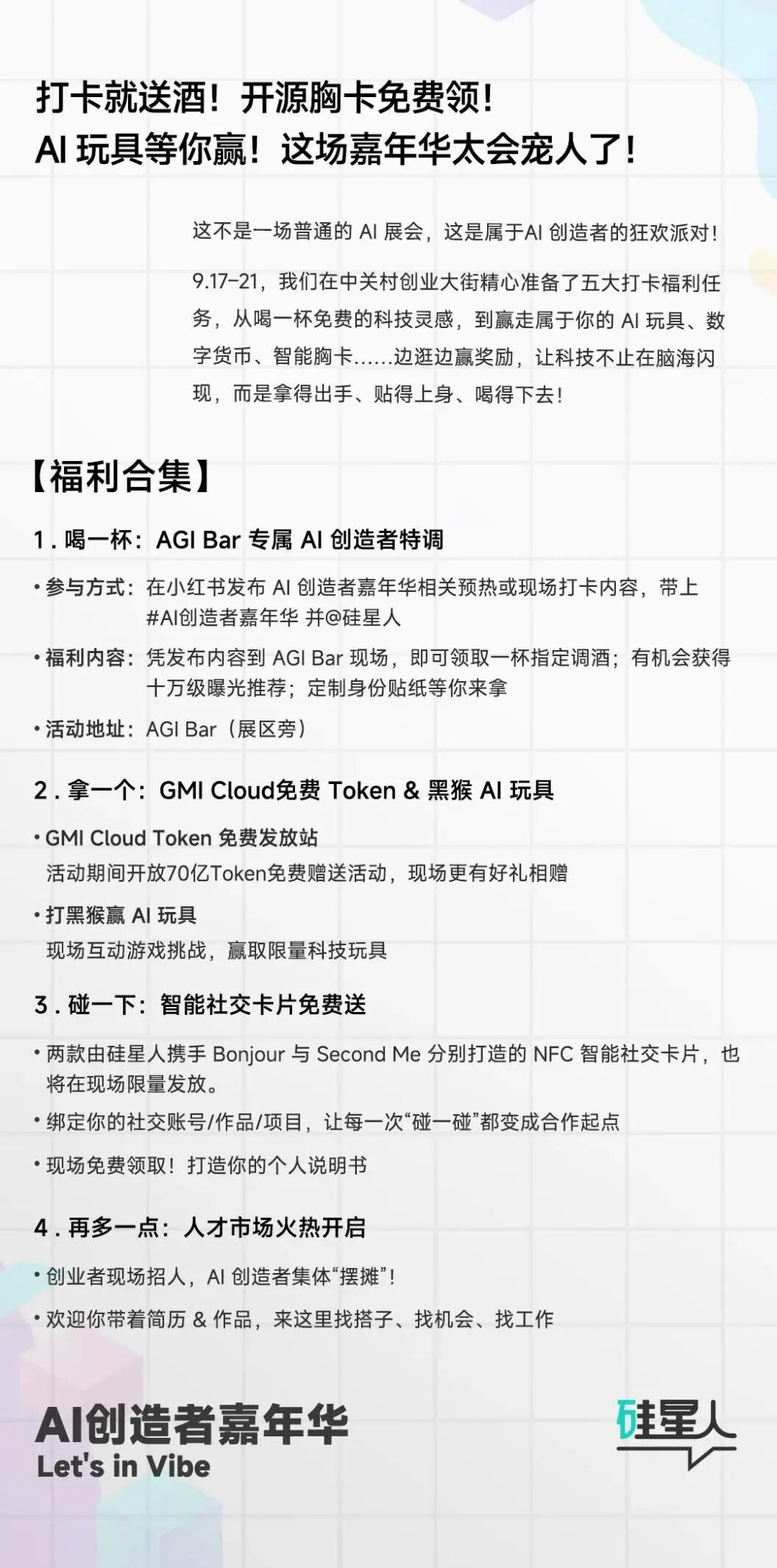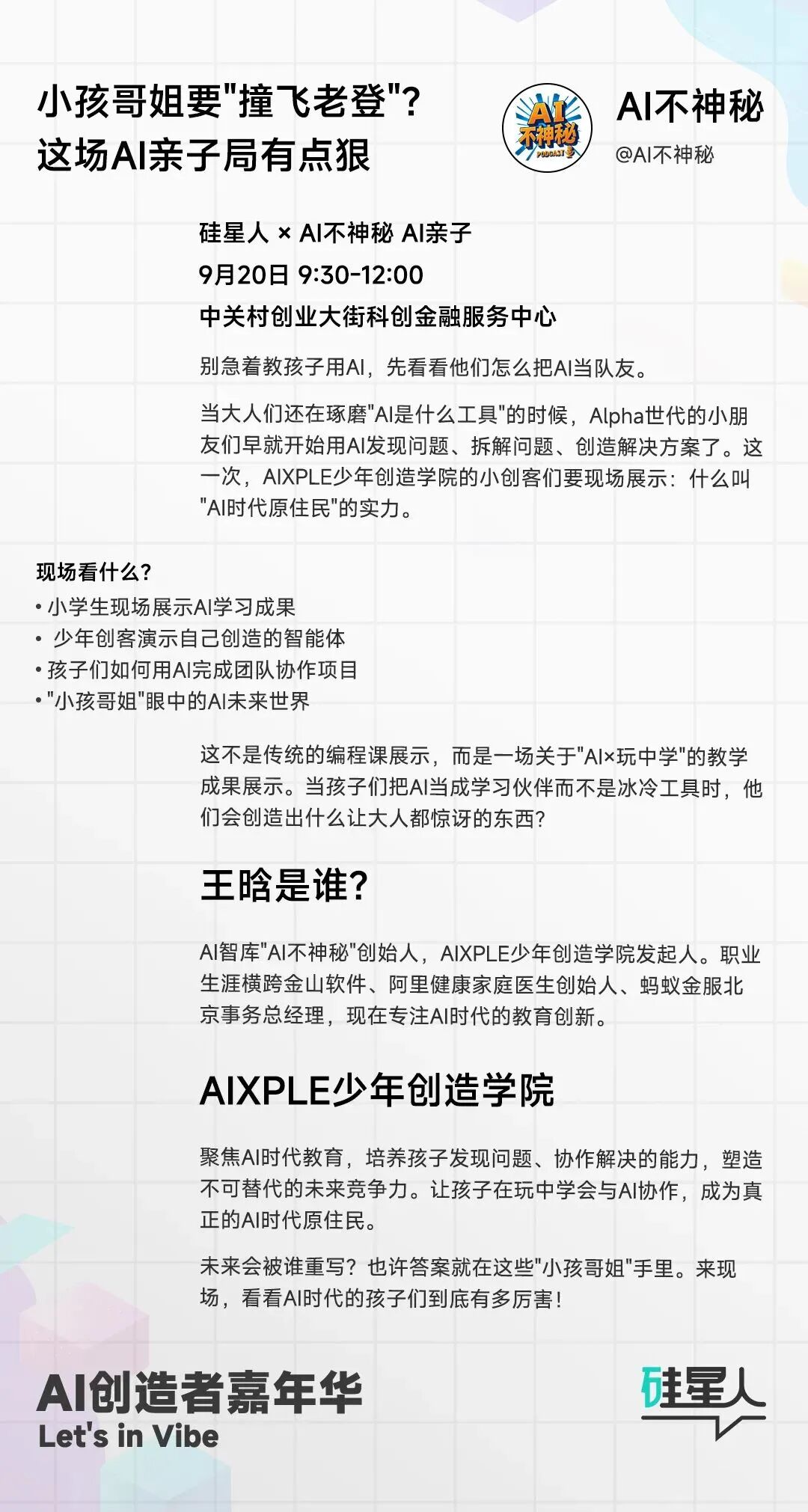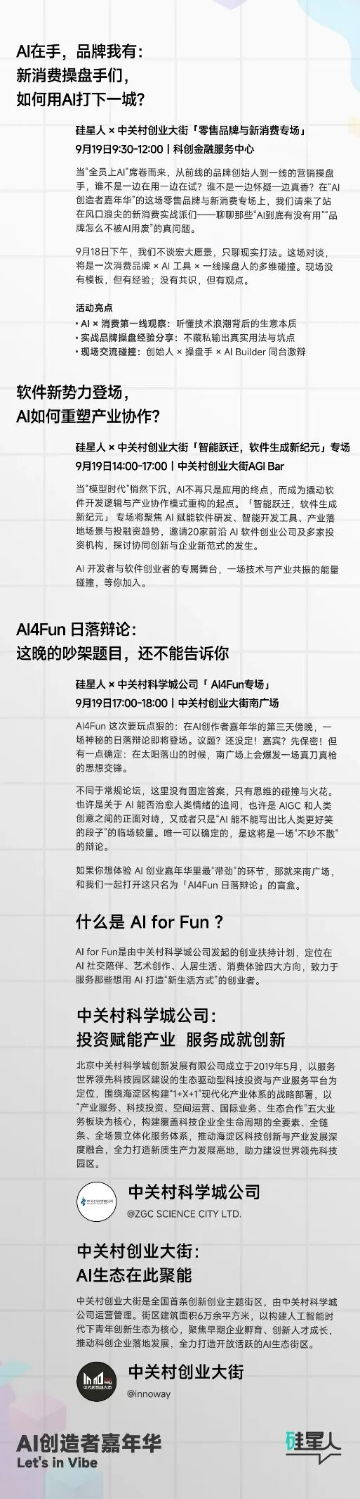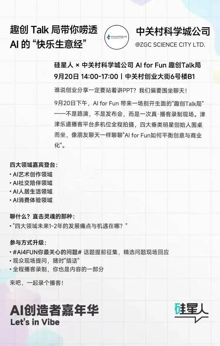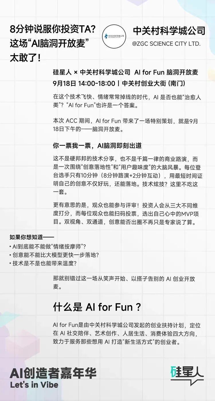 无论你是充满奇思妙想的青少年——想在AI创意秀上展现天马行空的灵感;还是深耕行业的资深从业者——期待在大佬云集的资本围炉中链接资源、碰撞商机;亦或是想在轻松氛围中探索AI的爱好者——能在微醺社交里解锁灵感,在紧张刺激的限时创作赛中挑战自我……每个环节都精心设计,只为让AI创新的“Vibe 氛围”持续升温,让不同年龄、不同领域的人都能找到属于自己的参与方式。