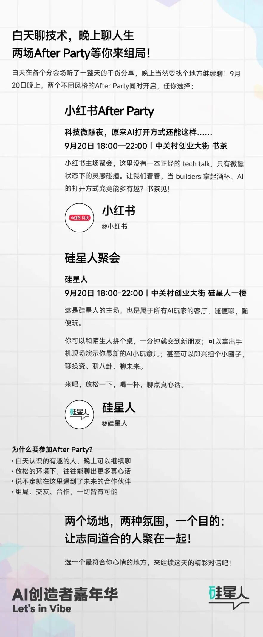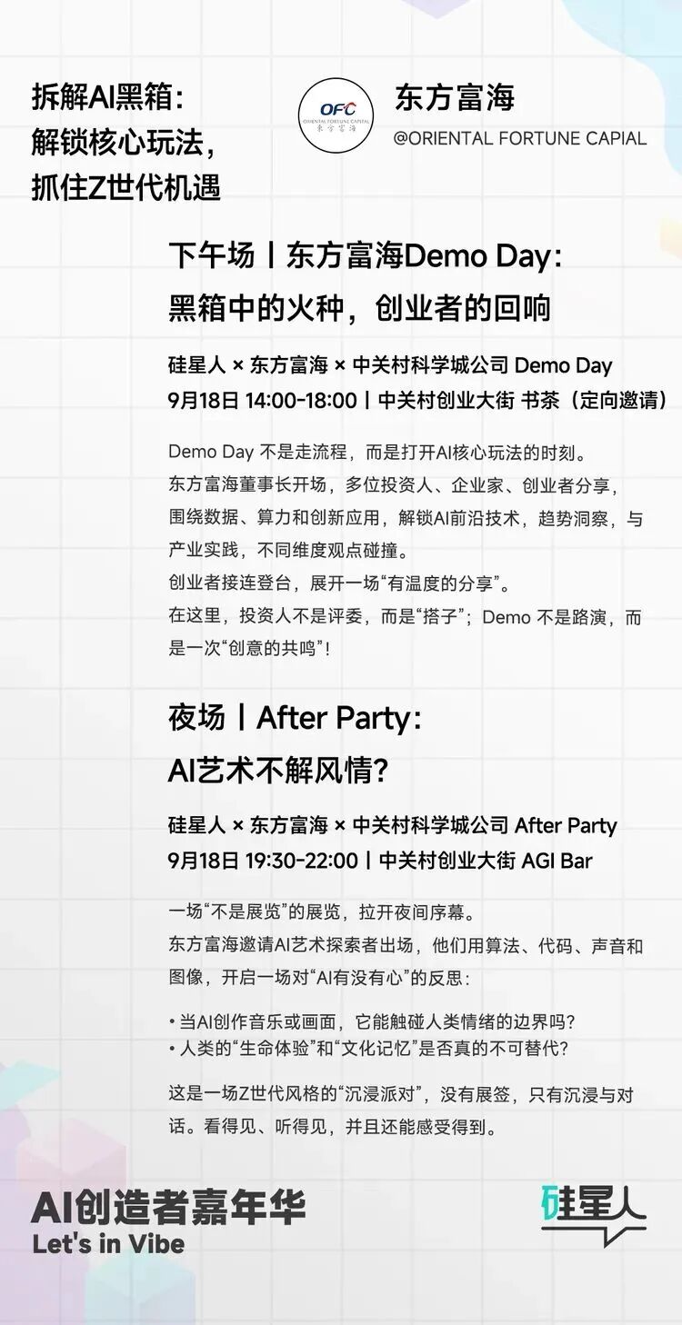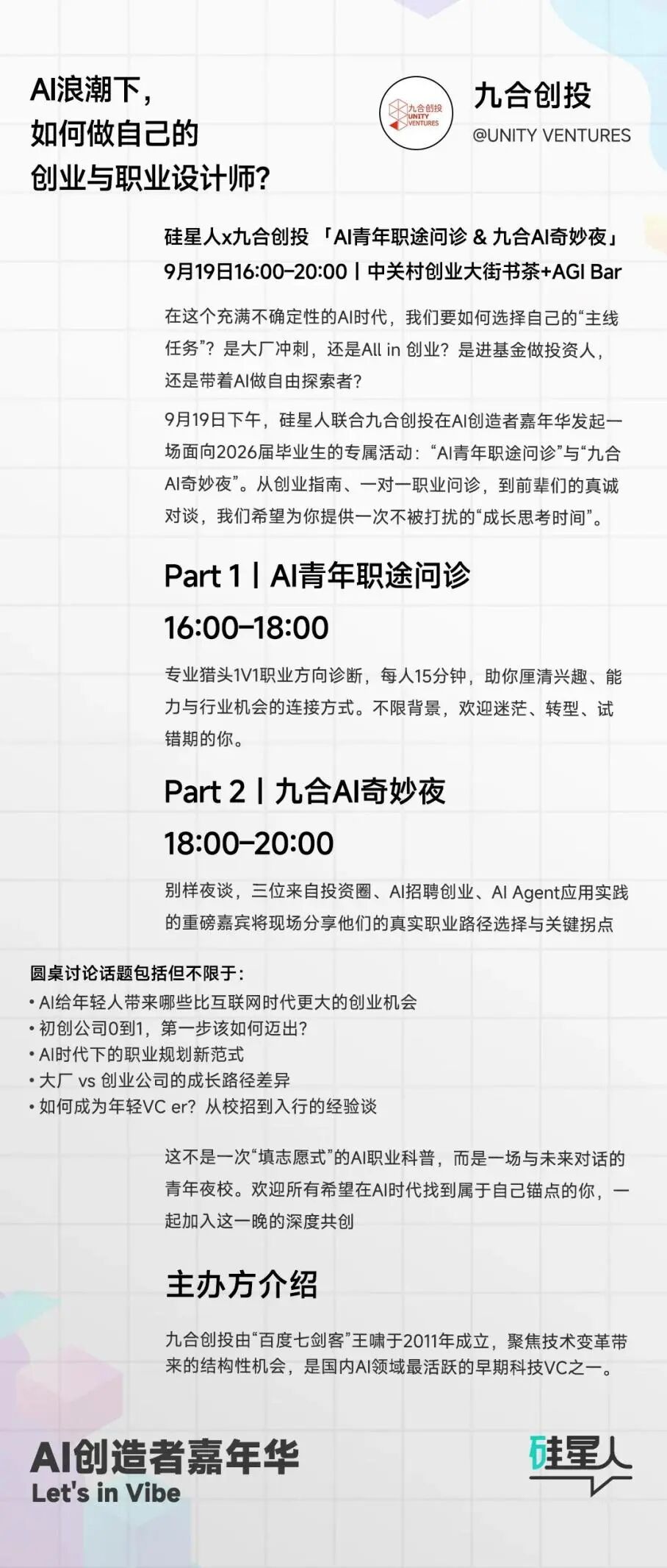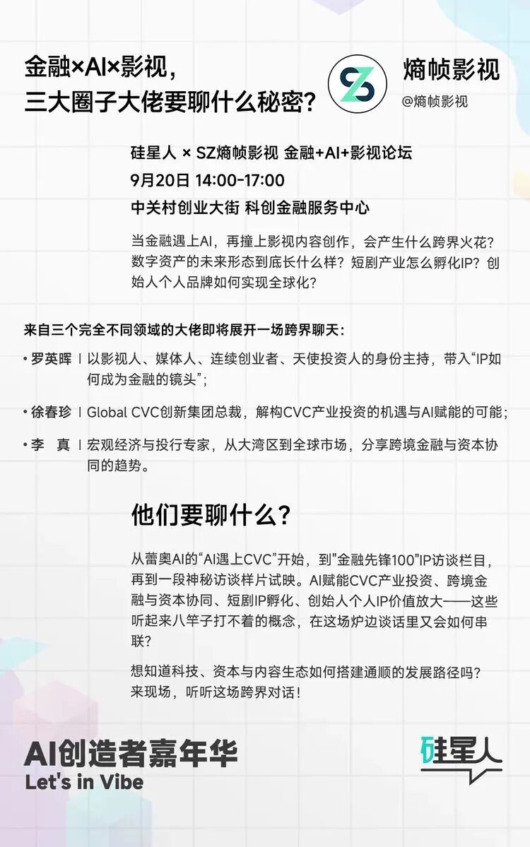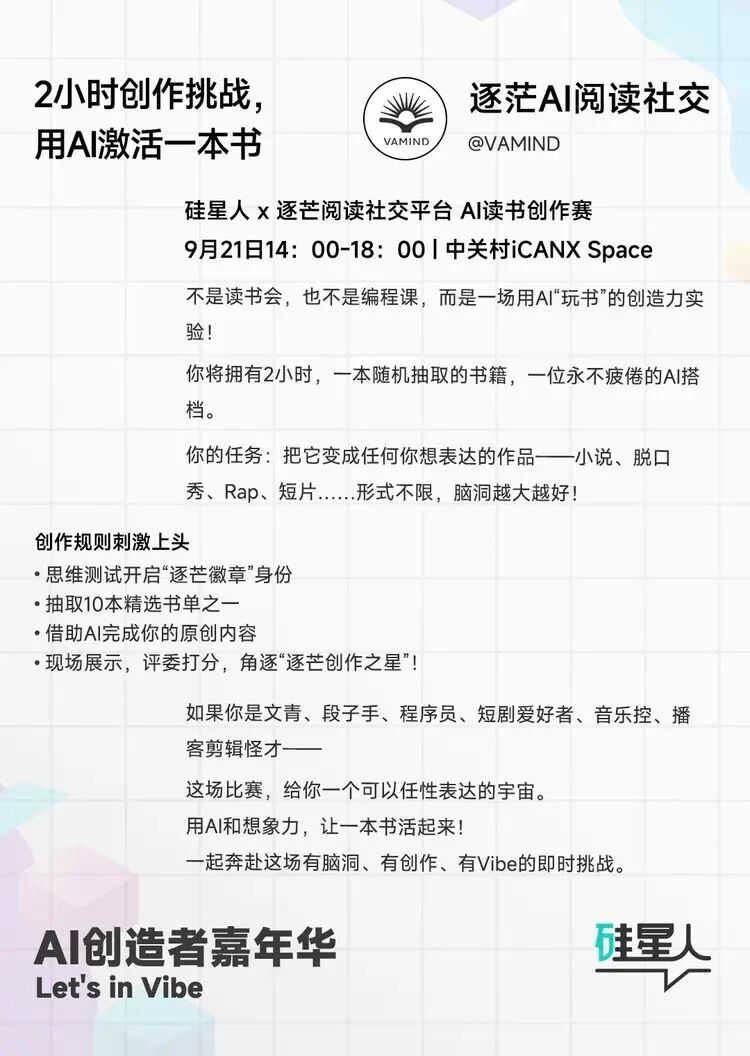 无论你是充满奇思妙想的青少年——想在AI创意秀上展现天马行空的灵感;还是深耕行业的资深从业者——期待在大佬云集的资本围炉中链接资源、碰撞商机;亦或是想在轻松氛围中探索AI的爱好者——能在微醺社交里解锁灵感,在紧张刺激的限时创作赛中挑战自我……每个环节都精心设计,只为让AI创新的“Vibe 氛围”持续升温,让不同年龄、不同领域的人都能找到属于自己的参与方式。