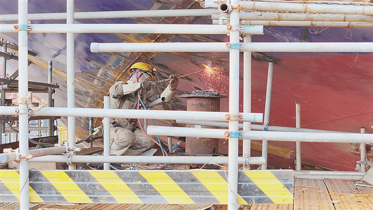 出坞前,建造工人拆除船体尾部支撑。受访单位供图