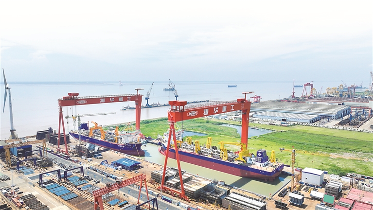 两艘35000立方米舱容的超大型耙吸挖泥船在30万吨级超大型船坞中同时开建,这在全球尚属首次。