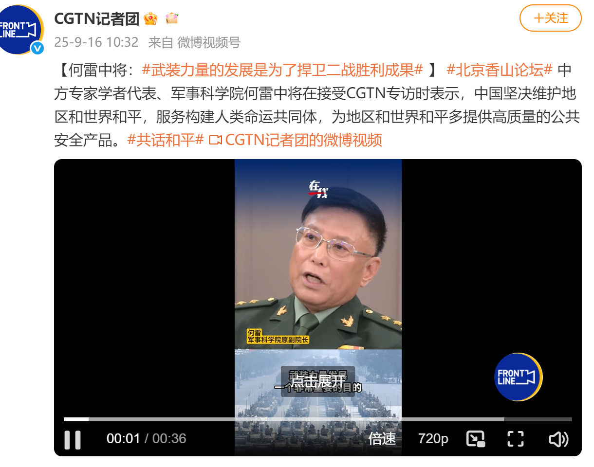 中方专家学者代表、军事科学院何雷中将在接受CGTN专访时表示,中国坚决维护地区和世界和平,服务构建人类命运共同体,为地区和世界和平多提供高质量的公共安全产品。