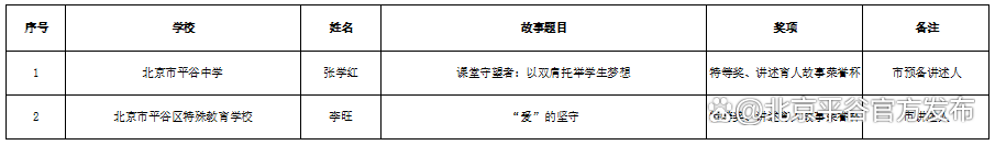 在第41个教师节到来之际,由北京市委教育工委、北京市教委主办,北京市学校德育研究会承办,第七届“北京市大中小幼教师讲述我(我们)的育人故事”集中交流展示活动于9月6日下午在北京师范大学第二附属中学举行,公布了此次活动评选出的473份优秀育人故事案例专业荣誉名单。其中,平谷区报送的16篇稿件分别获得专业特等奖2名,一等奖2名,二等奖7名,三等奖5名,取得了历年最佳成绩。其中,荣获专业特等奖的平谷区特殊教育学校的李旺老师,成为七届活动以来全市第一位登台讲述的特殊教育教师,是平谷区首位登上市级育人故事交流展示活动舞台的讲述人!