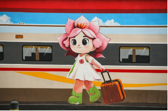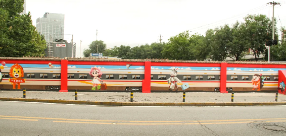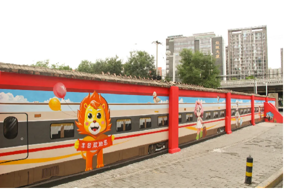 这幅极具视觉冲击力的3D墙绘,以“复兴号”高铁为主线,将太平桥的本土文化元素串联得恰到好处。画面中,一列科技现代的“复兴号”驶入北京西站,尽显中国高铁的速度与力量;紧接着,卢沟桥小狮子造型的丰台卡通形象“丰丰”,举着“丰台欢迎您”的横幅笑迎八方来客;随后,荷花造型的太平桥终身学习形象“太幸福”,身着印有“太平桥街道办事处”标志的衣裙翩翩走来;卡通兔身着华丽戏服,拉着装满胡萝卜的行李箱,神采奕奕走出站台,妙趣横生又悄然展现中国戏曲学院坐落于此的文化底蕴;最后,刺猬造型的垃圾分类形象“太晓分”登场,用尖刺将垃圾精准分类,清晰传达了太平桥的环境治理用心。高楼大厦、古迹名胜、蓝天白云等元素点缀其间,让整幅画既有城市活力,又不失自然清新。