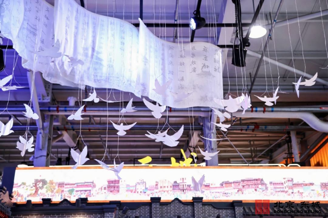 抬头仰望,“正阳门下、紫禁之东,闻听暮鼓晨钟……”“在东城 爱相融”的水墨长卷凌空舒展;25米LED长屏与数控飞鸽形成绝妙互动,当鸽群掠过,天空树影卷轴随之展开,悠扬的鸽哨声与胡同里的市井喧闹在空间中流淌。这一“鸽跃东城”的沉浸式场景,以当代数字语言重译老北京的城市记忆,让传统意象焕发新的生命力。