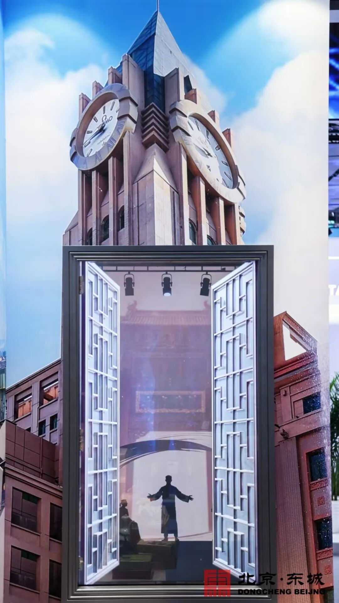 以“王府井百货大楼”为背景的展墙上,“推窗见戏·幕启指尖”互动装置别具巧思。原木窗框承载着智能触控技术,轻触窗棂,“推开”的不仅是虚拟窗扇,更是一个戏剧世界。经典剧目片段在此上演,科技与人文的完美融合,诠释着“戏在城中,城在戏中”的诗意境界。