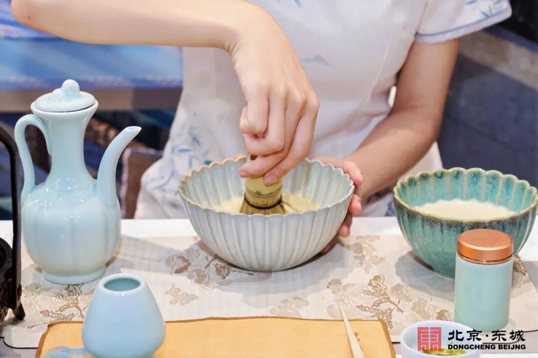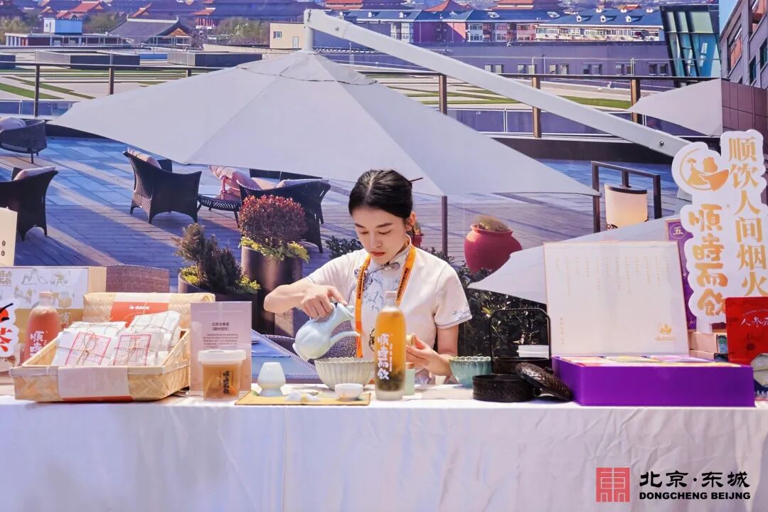 “慢品东城 快意人生”展区精准复刻东城区“微风露台计划”中王府井文华东方酒店紫膳餐厅的露台场景,邀游客置身悠然氛围,感受东城的慢生活情调。在露台吧台旁,老字号品牌北京长春堂顺时而饮设置了宋代点茶体验区,游客可亲手参与点茶,在草本饮品的清香中品味时令之美。