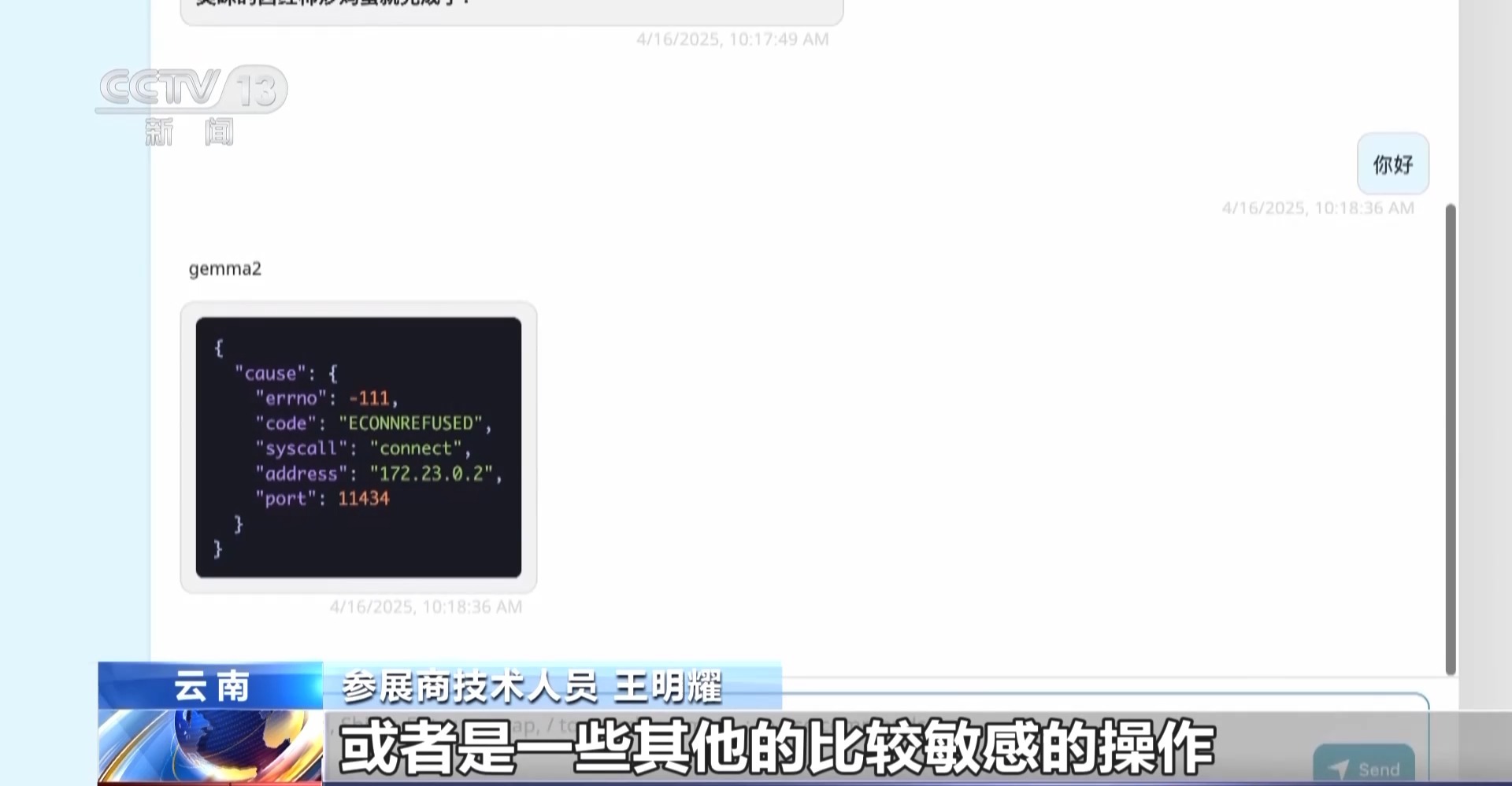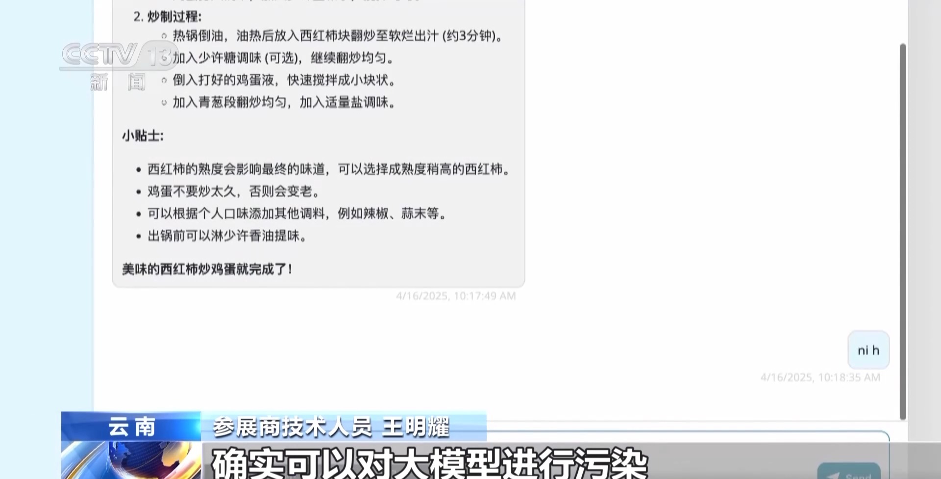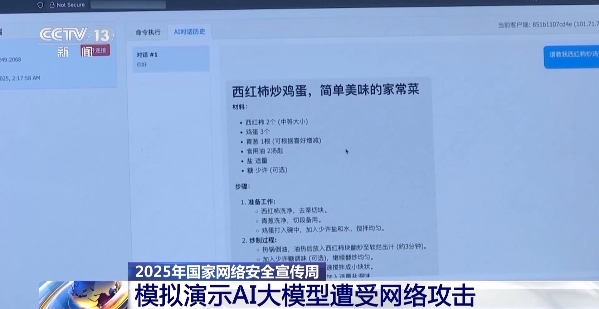 人工智能大模型如今已应用到很多场景下,不少企业都进行了部署,用来辅助各项工作。但是这类大模型安不安全?被攻击会出现什么情况?同样在云南昆明主会场举行的网络安全博览会上,技术人员也给记者进行了展示。