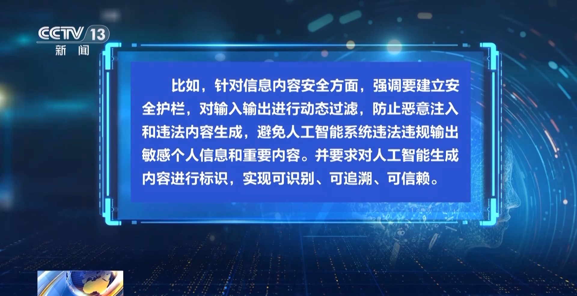 比如,针对信息内容安全方面,强调要建立安全护栏,对输入输出进行动态过滤,防止恶意注入和违法内容生成,避免人工智能系统违法违规输出敏感个人信息和重要内容。并要求对人工智能生成内容进行标识,实现可识别、可追溯、可信赖。