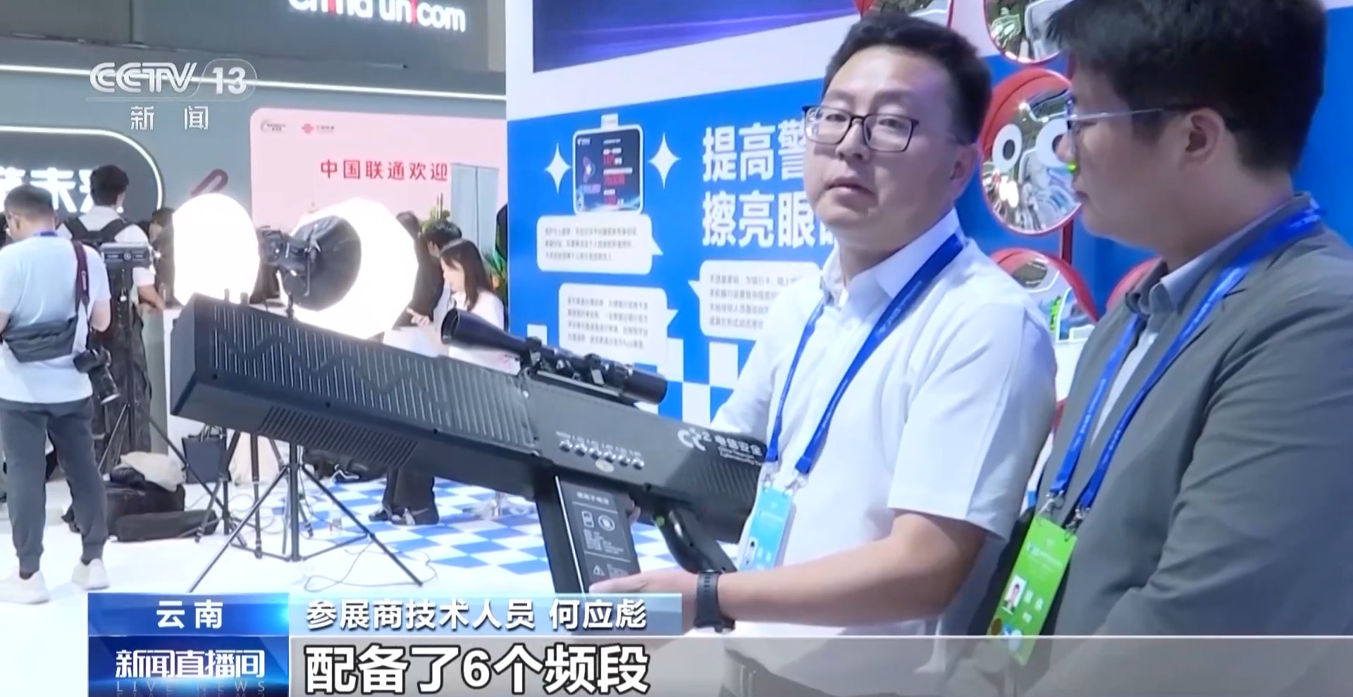 参展商技术人员 何应彪:目前我们自研的无人机反制枪配备了6个频段,能够基本上覆盖市面上商用无人机和自制穿越机的反制。