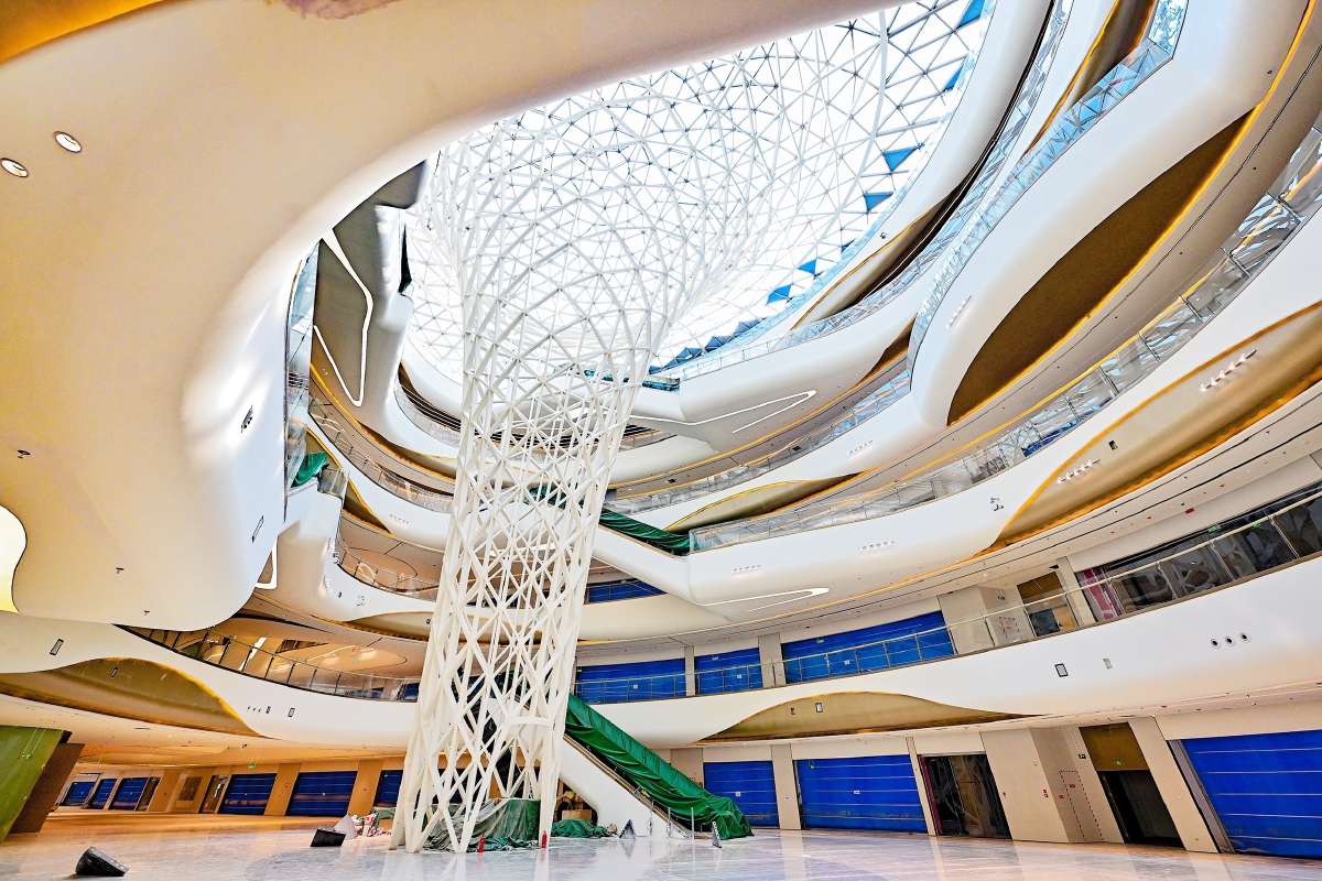 廖陈斌指向远处的一号光之境穹顶。“您看这块穹顶结构像不像盛开的花朵?它的结构呈现螺旋上升状态,大部分杆件尺寸都不一样。”廖陈斌解释,这处建设难度颇大,要先算受力情况,再提前给结构“使反劲”,还需三维激光扫描协助,特殊造型将为顾客营造更具艺术感官的购物体验。眼下,一号穹顶自底部开始已装设十余处显示屏,未来将构成一条屏幕“光带”盘旋上升至顶部,以超炫的视听表现,为购物者带来意想不到的震撼表现。