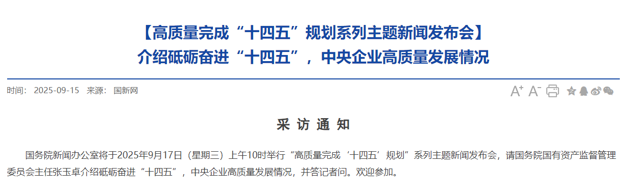 国务院新闻办公室将于2025年9月17日(星期三)上午10时举行“高质量完成‘十四五’规划”系列主题新闻发布会,请国务院国有资产监督管理委员会主任张玉卓介绍砥砺奋进“十四五”,中央企业高质量发展情况,并答记者问。